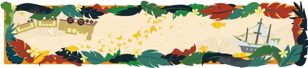 这些元素被拉丁美洲热带丛林的树叶所环绕,形成和谐而奇妙的循环,正如《百年孤独》书中人物的命运,这一场贯穿百年的孤独不过是循环往复的轮回。