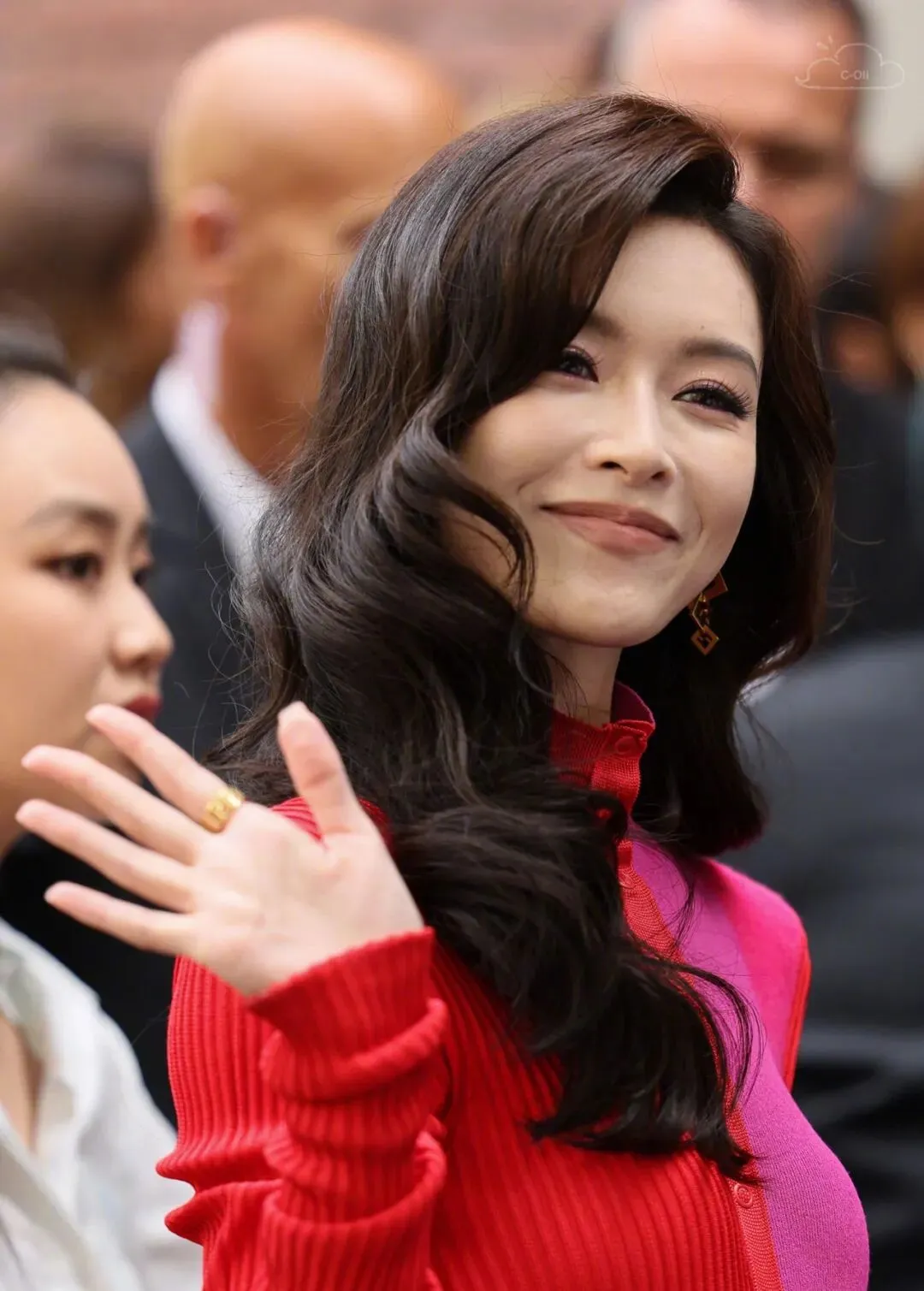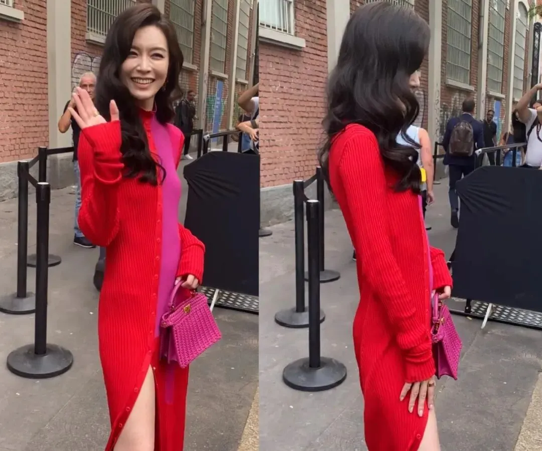文咏珊出席时装周,穿了一条玫红拼珊瑚红的高开叉针织长裙。一般人可能驾驭不了这么俗的颜色,但美女可以。