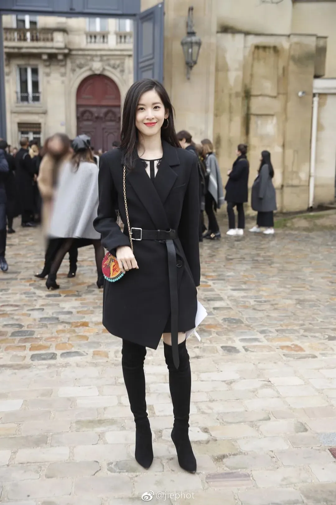 让我想起了真正的女富豪章泽天,在被Dior邀请看秀时穿了一身简约黑色西服套裙。