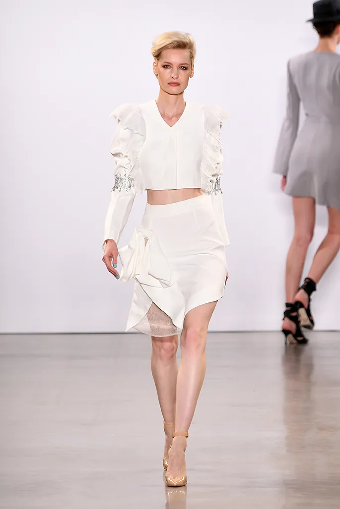 模特在T台上穿TAORAY WANG走秀,举手投足之间又飒又美,看秀的通常也可以一秒代入,仿佛自己下一秒就要走上华尔街头,开启一段华丽的事业篇章。
