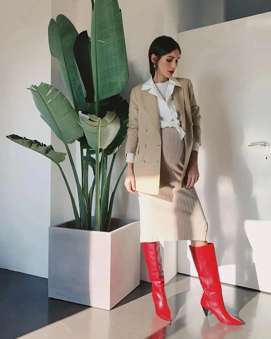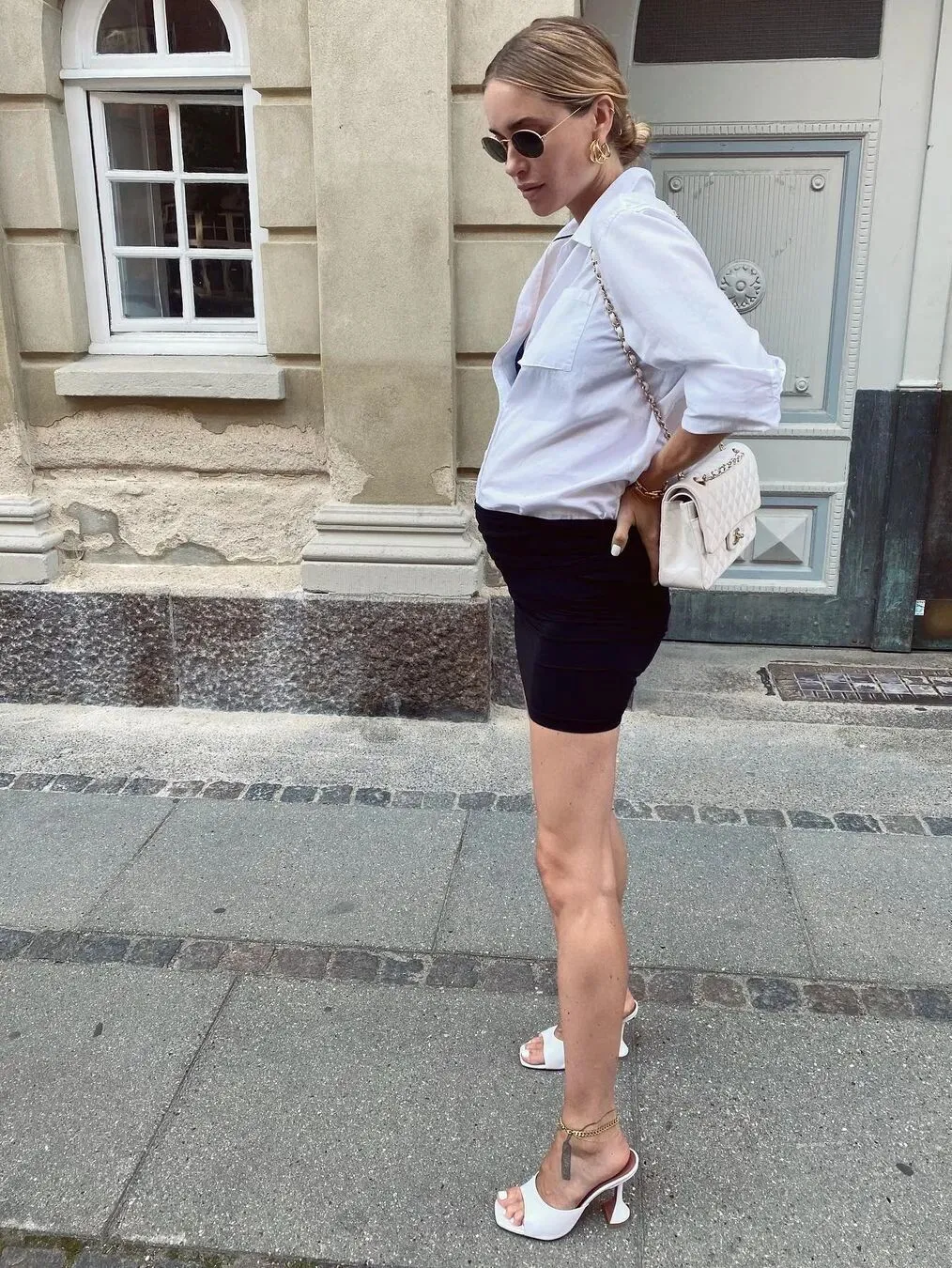 丹麦造型师Pernille Teisbaek用白衬衫搭配高腰裤,同样也是孕期不错的选择,搭配贴身的高腰裤,显得非常干练。
