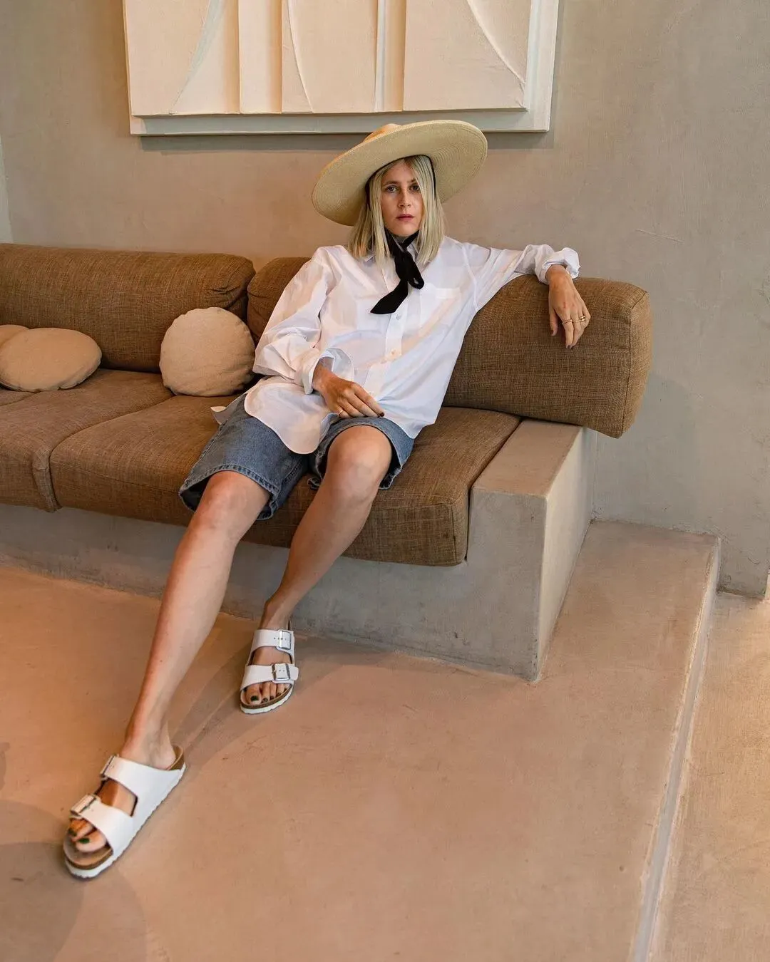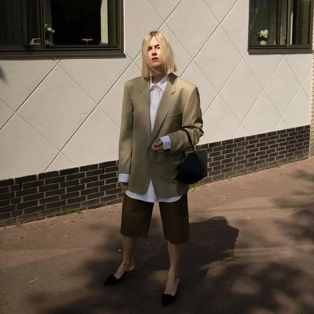 时尚博主们很喜欢这种衬衫+短裤,搭一双拖鞋打造一种假期随性的感觉,舒适度也极高。