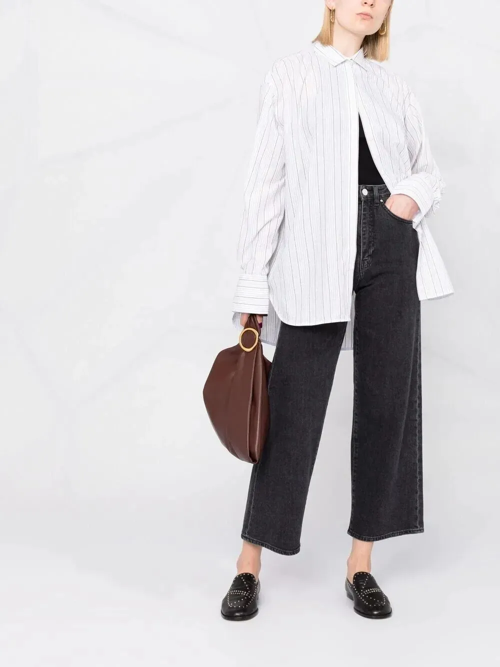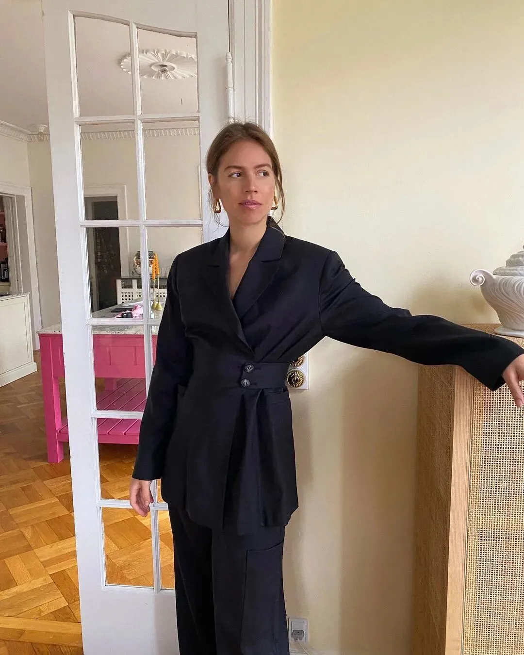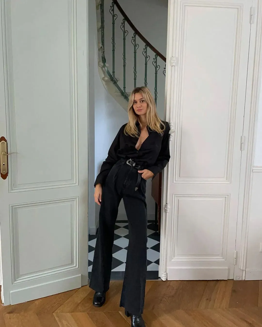 Musier创始人Anne-Laure Mais喜欢用衬衫打造all black的风格,黑衬衫搭黑色微喇牛仔裤,不同面料为造型带来层次感,金属Logo腰带为整体创造一个重点,又酷又高级。