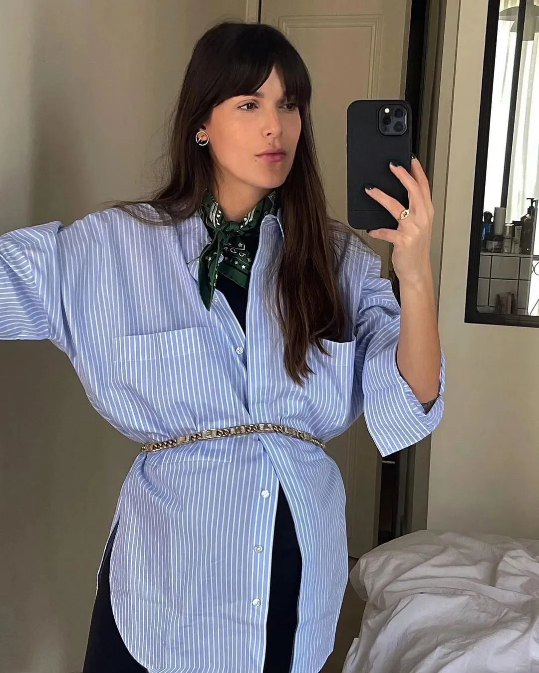 或者去衣柜里拿一件先生或是男友的大号衬衫,像穿搭达人Leia Sfez这样随意地搭一根金属腰带用来收腰,随性又有巧思。