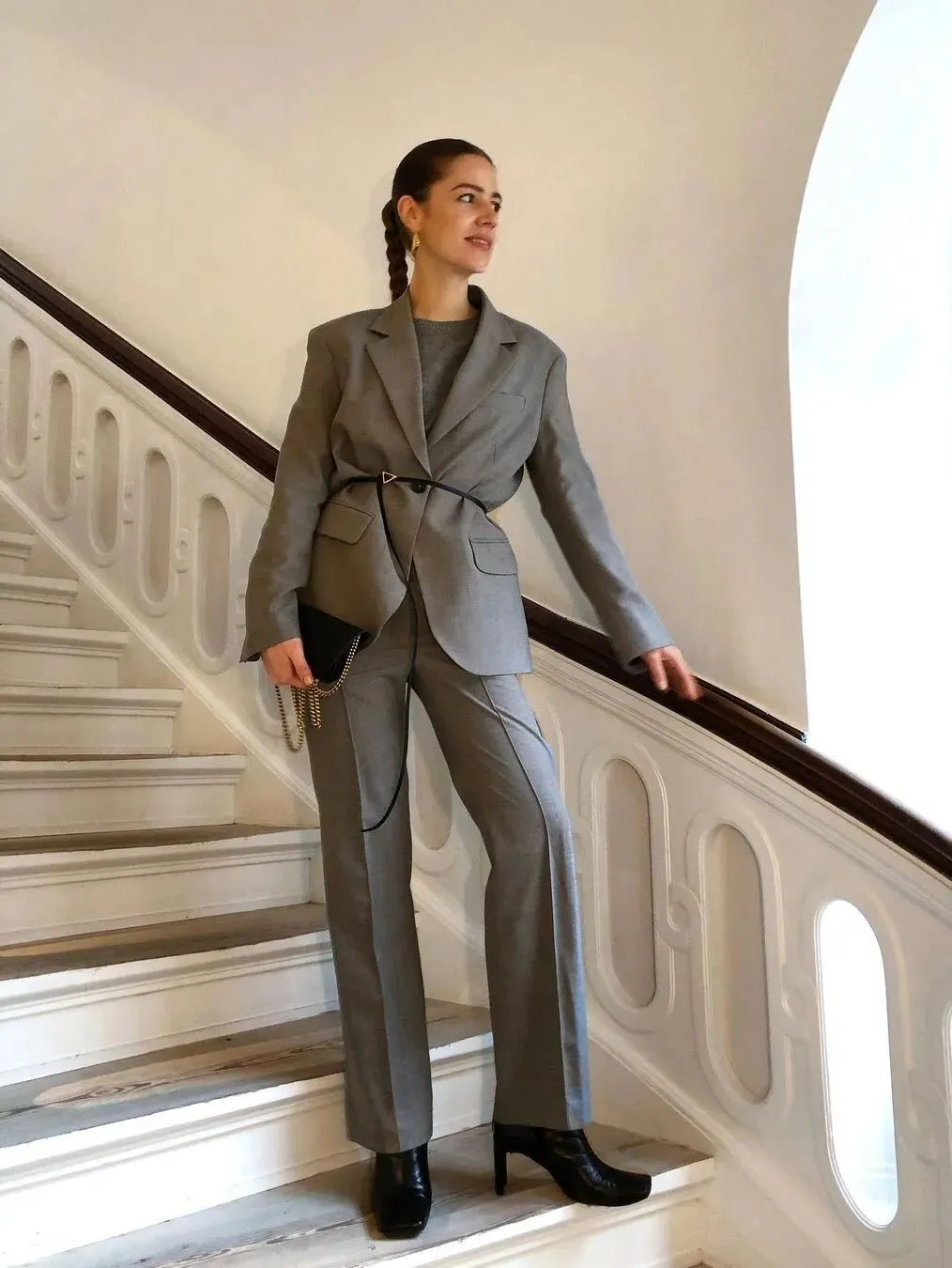 大廓型的西装宽松对处于孕期任何阶段的体型没有要求与束缚,西装自带的线条感自带气场,只要遵循上松下紧的原则随意选择简单的内搭即可,整体随性但不单调。