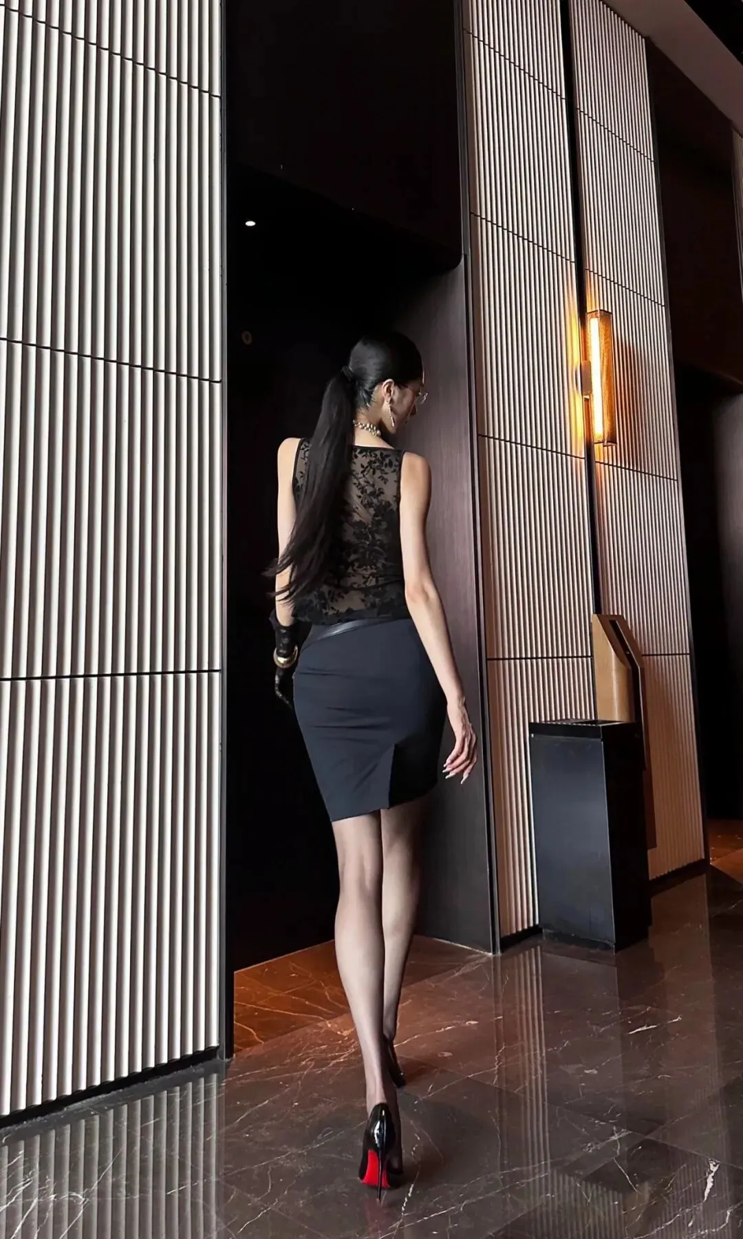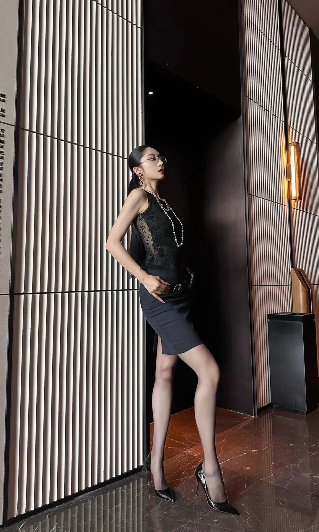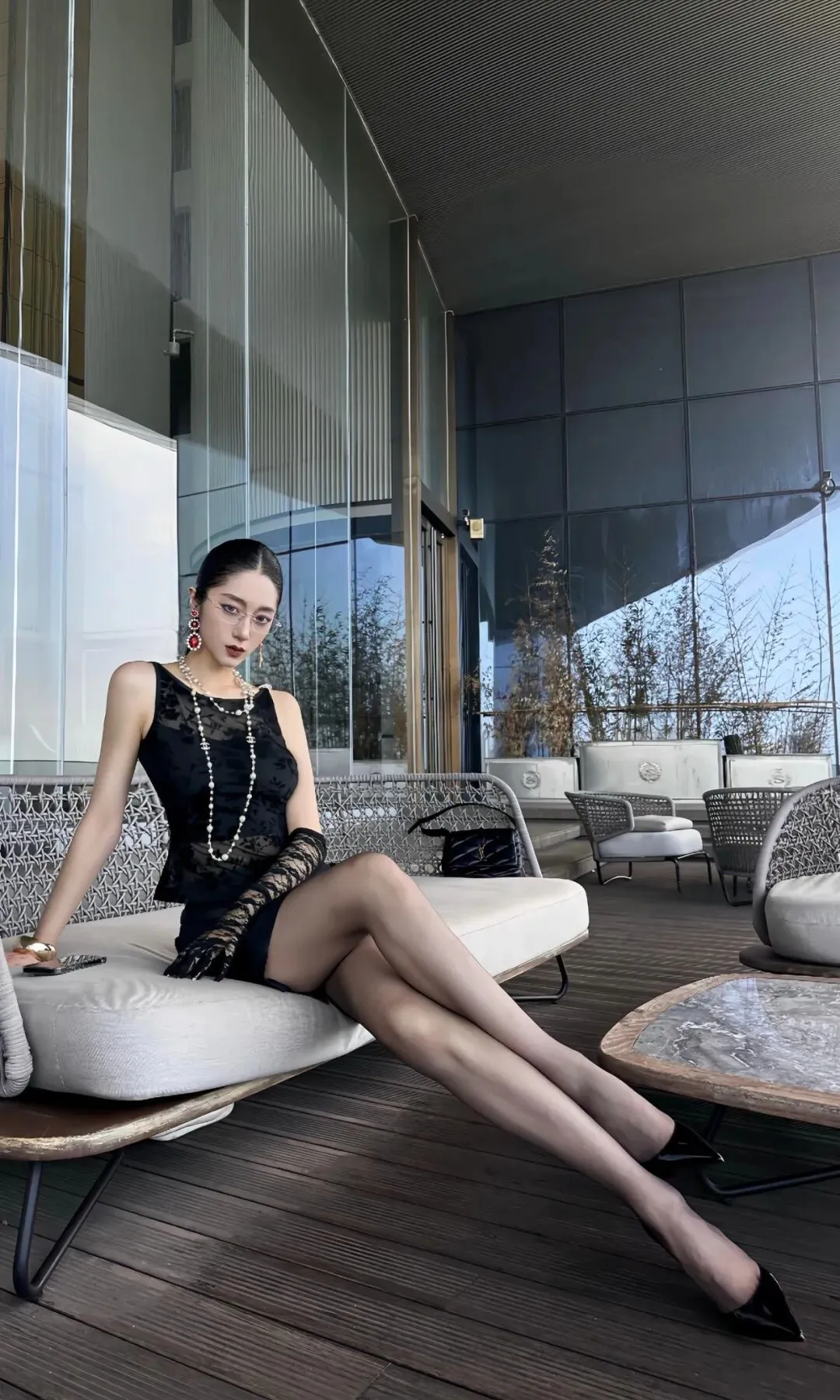 一位时尚感十足的女性,穿梭于室内走廊与户外休闲区域。她的头发乌黑顺滑,梳成低马尾,显得干练利落。妆容精致,红唇提气场,眼镜增知性。她上身穿着一件黑色无袖蕾丝上衣,蕾丝花纹细腻,半透明材质增添神秘性感。下身搭配一条黑色短裙,裙长适中,凸显修长美腿。她脚上穿着一双黑色高跟鞋,鞋跟细长,走动间尽显优雅姿态。她还佩戴着多串珍珠项链,增添复古韵味,搭配精致的大耳环,整体造型华丽。她或单手插兜靠墙而立,身姿挺拔;或坐在户外沙发上,双腿交叠,姿态闲适。背景中的室内走廊线条简洁,灯光温馨,户外区域则布置有沙发、茶几,环境舒适宜人。从男性关注的角度看,这些图片蕴含着不少值得探讨的内容。穿搭方面,男性虽较少选择蕾丝这类元素,