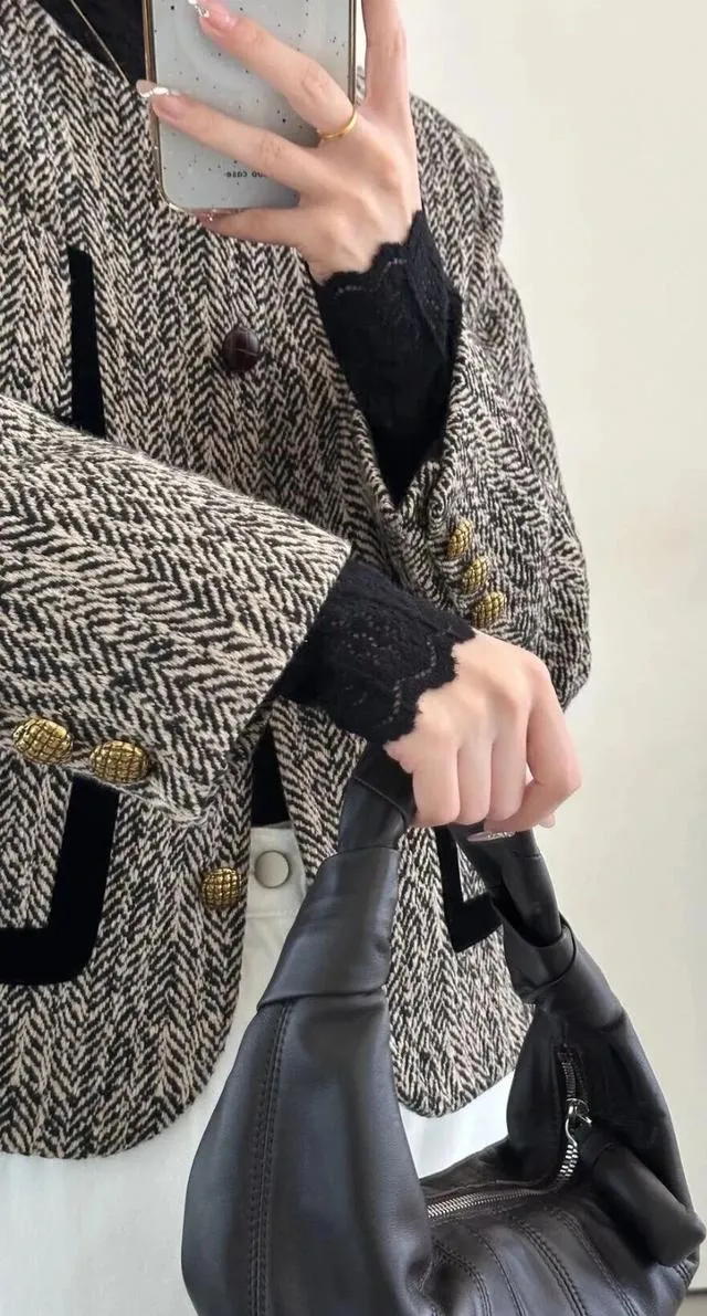 我最爱的一个组合是:‘黑色蕾丝打底衫+小香风粗花呢外套+白色直筒牛仔裤’。黑白对比鲜明,整体看起来又利落,又贵气,参加聚会或者日常通勤,效果都很OK。