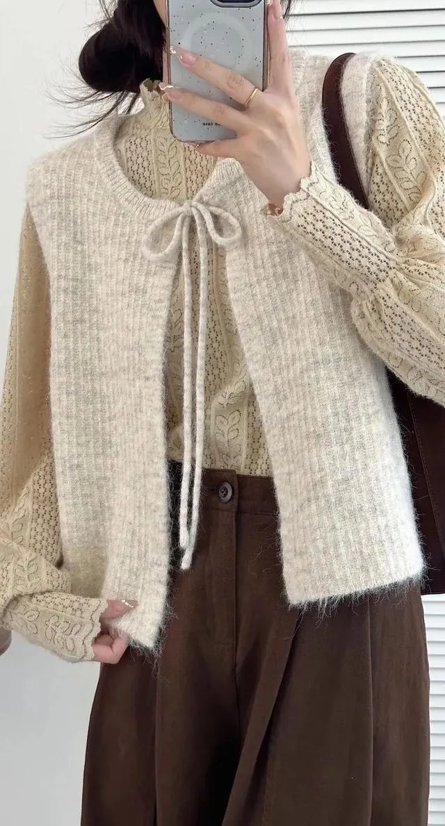 或者,用卡其色的蕾丝打底衫,搭配同色系的无袖马甲和咖色阔腿裤。脱下马甲时,是温柔的小清新;穿上马甲,层次感立刻出来,显得人很瘦很高。这一身,暖暖的,懒懒的,很有日杂里那种不费力的时髦感。