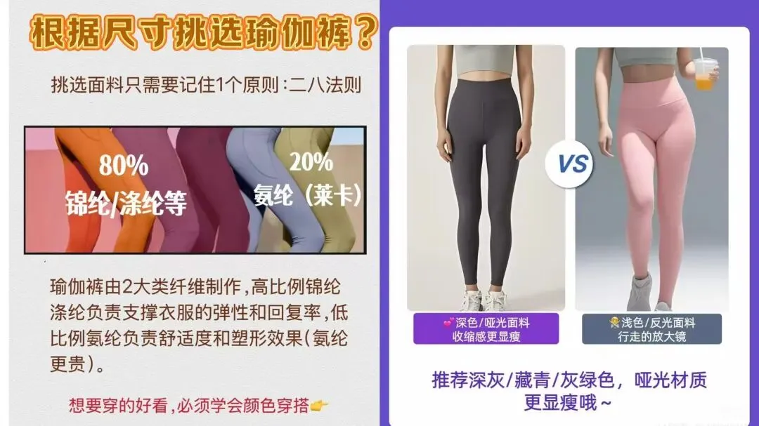 最后我们挑选瑜伽裤的时候还要选对合适的版型和腰线,最常见的腰线就是高腰的款式,最常见的腰线高度就是在7-10cm左右,这样不仅可以包裹住我们腹部的赘肉,同时还能显高显瘦显腿长。颜色方面尽量挑选深色系,这样可以起到收缩效果,视觉上会更显高显腿长。
