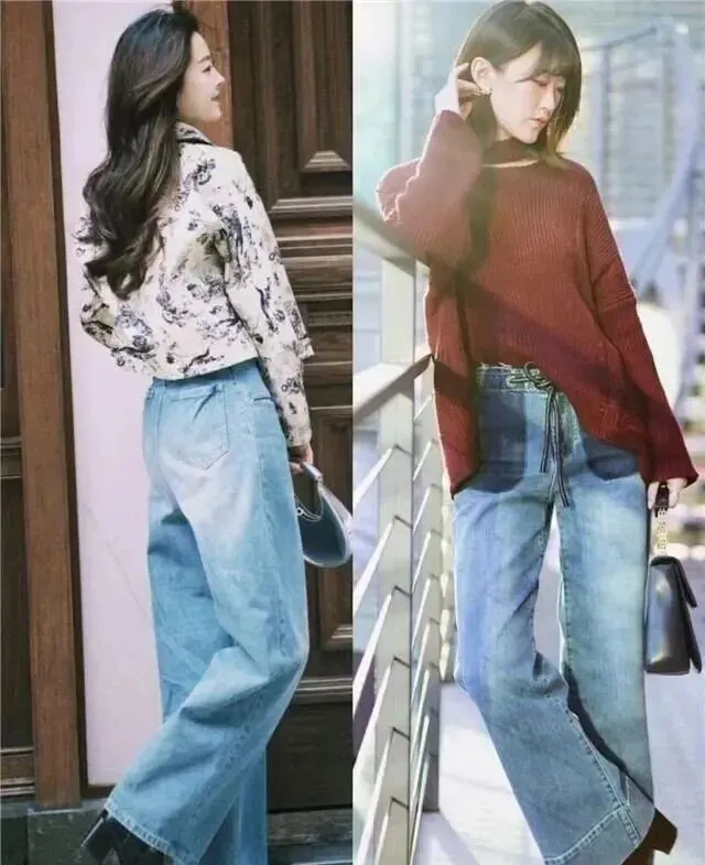 • 阔腿牛仔裤:别选太拖地的,刚好盖住脚面最显高。太软的牛仔布版型不立体,会显拖沓。