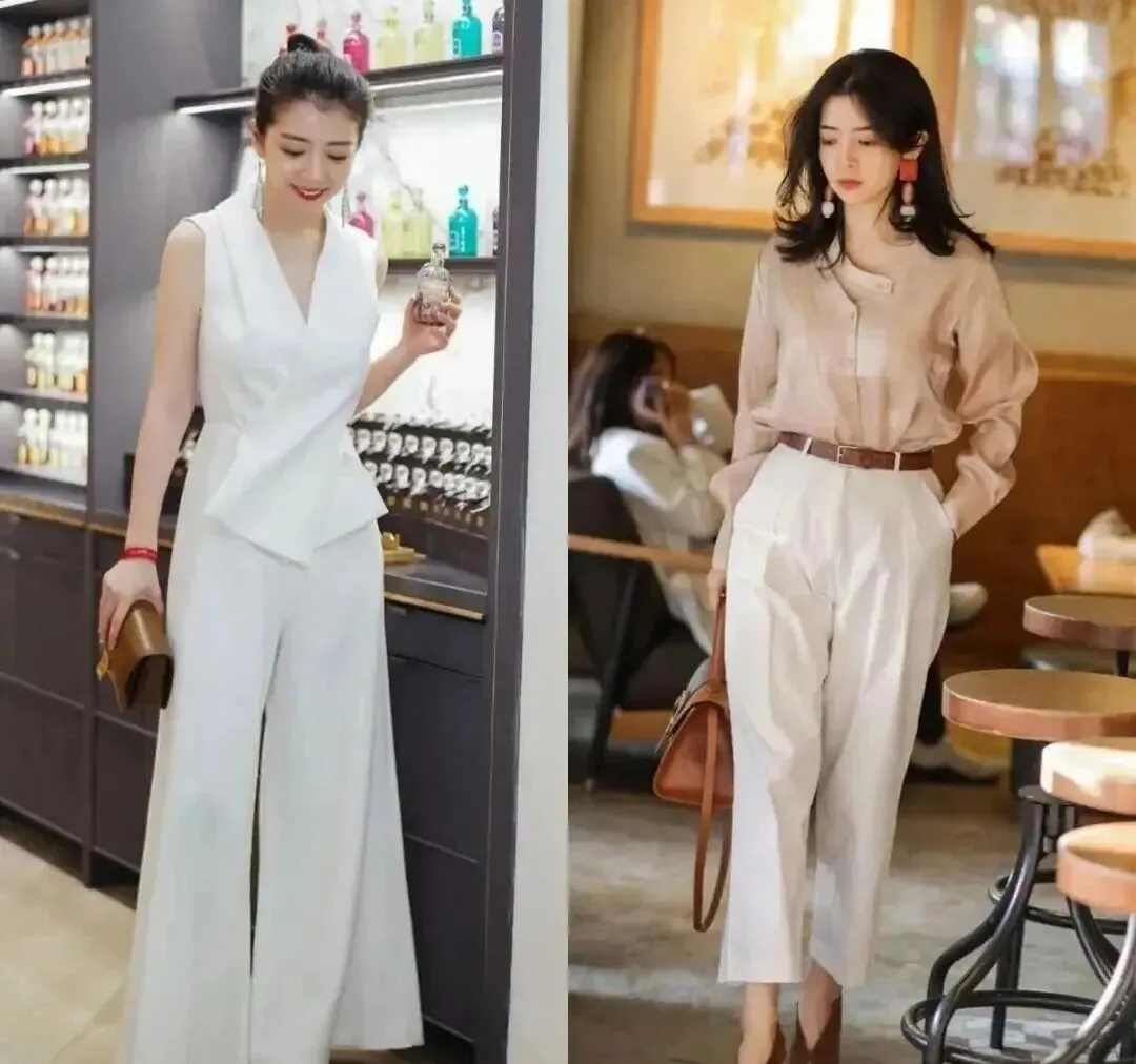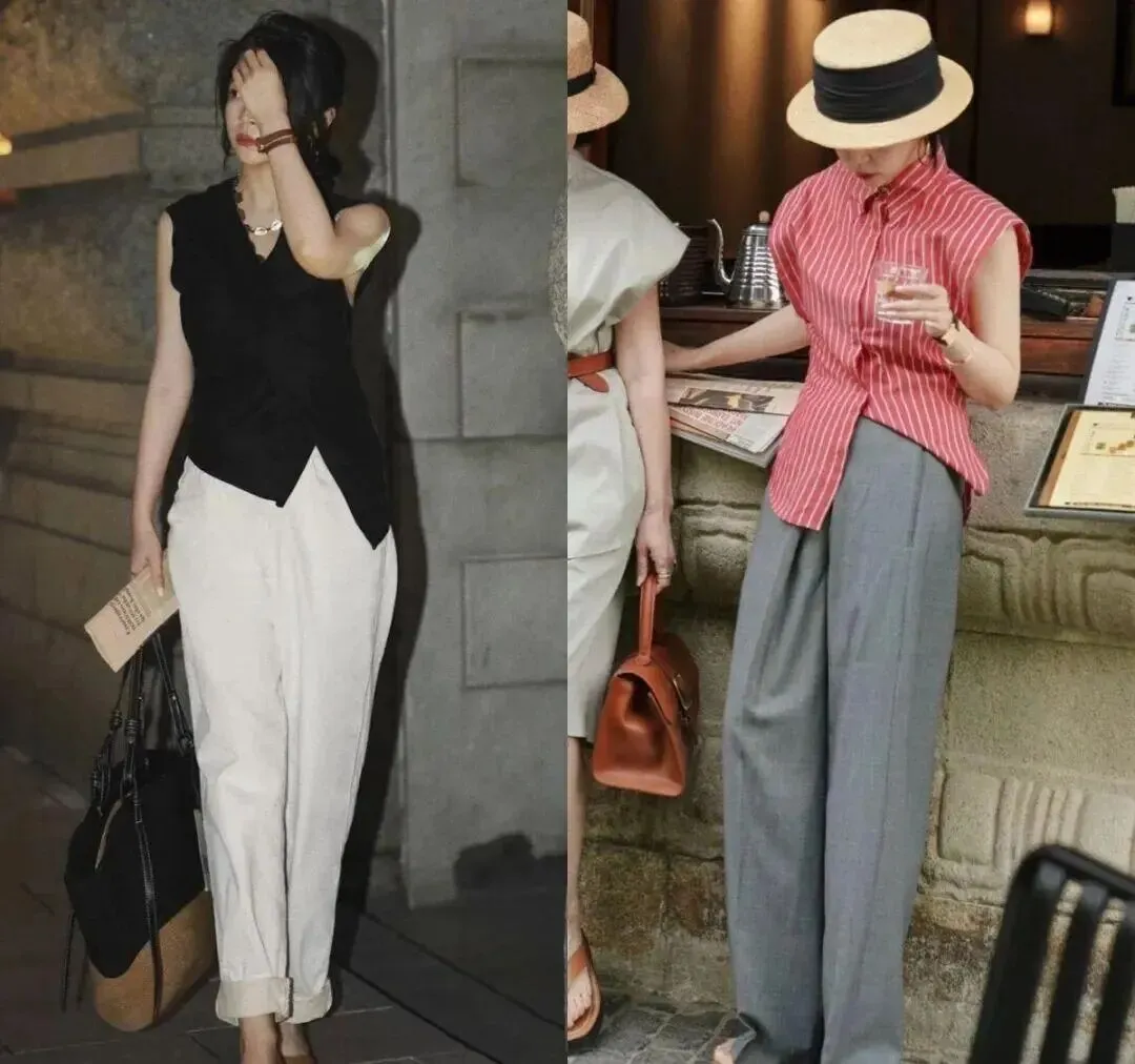 • 知性挂:无袖衬衫+锥形裤(适合上半身瘦、想打造精致通勤感的人)