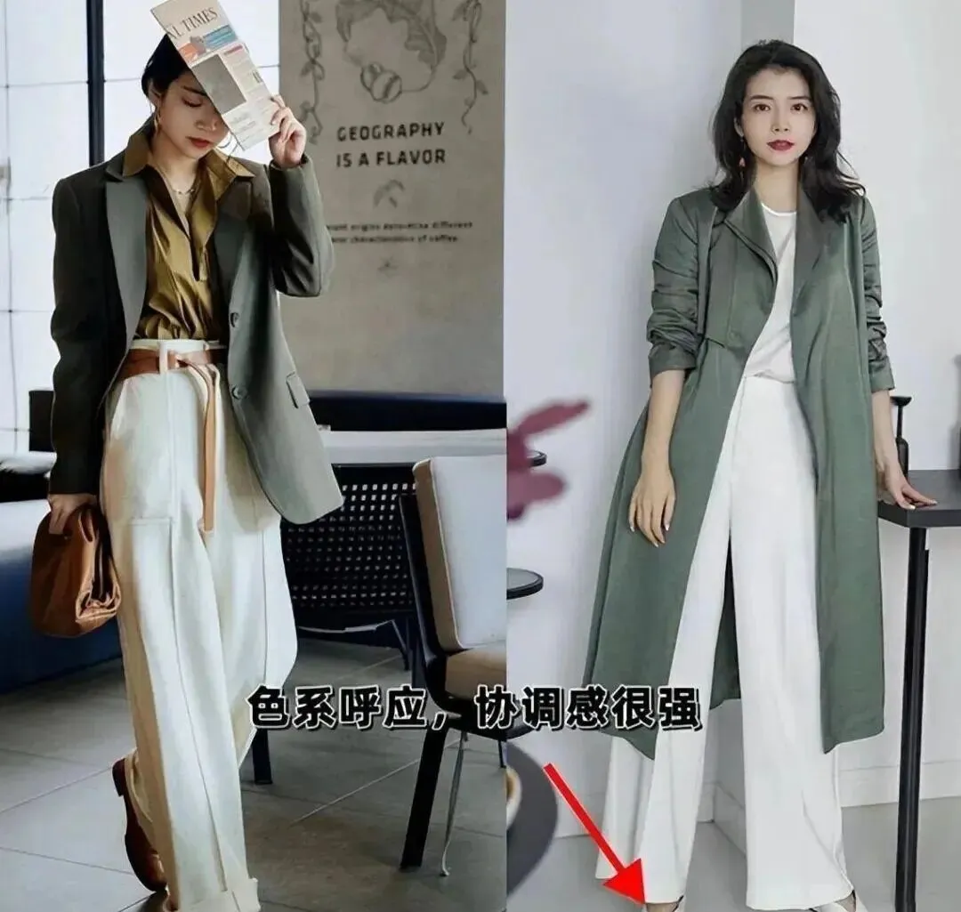 • 颜色呼应是关键:比如裤子和鞋子同色,或者包包和腰带同色,看起来就会很整齐、很懂搭配。