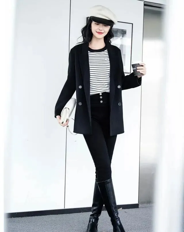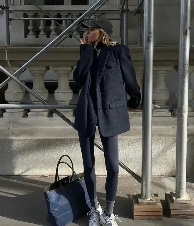 普通西装太薄了 , 冬天扛不住 , 毛呢西装保暖又有型。 叠穿之后不会臃肿 , 反而衬得身材很利落 , 和瑜伽裤简直绝配!