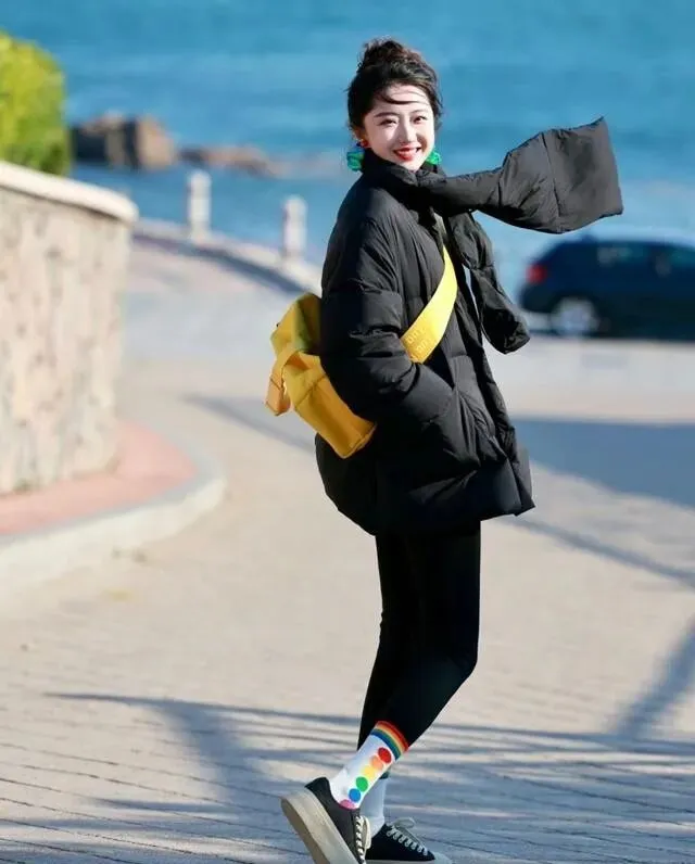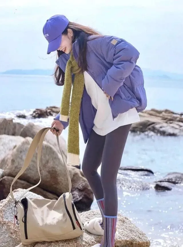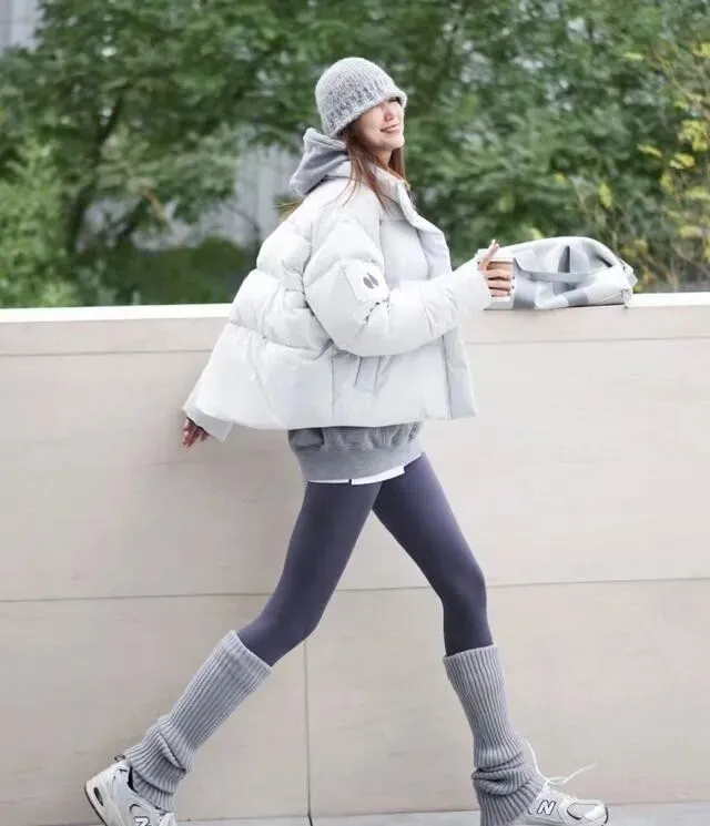 保暖这块没得说 , 紧身瑜伽裤配宽松羽绒服 , 经典的上松下紧 , 休闲又减龄。