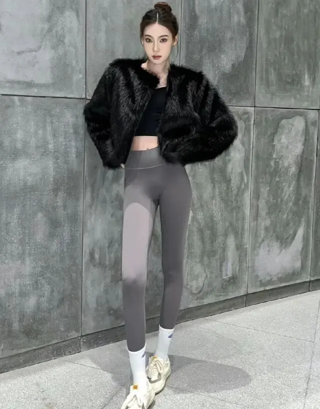 这个组合有点撞风格的意思 , 皮草的贵气配上瑜伽裤的运动感 , 意外的时髦。