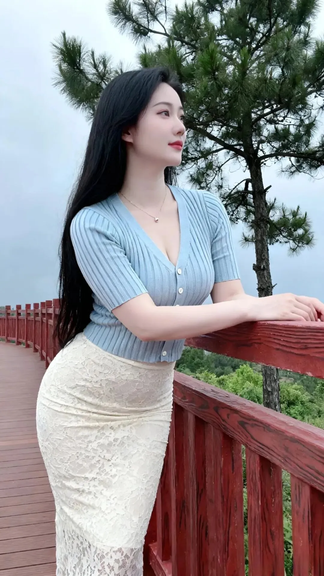 那天阳光正好,风也温柔。我穿着那件浅蓝色的针织开衫,配上米白色的蕾丝半身裙,站在山间的木质栈道上。刚找了个光线不错的角度,还没来得及整理被风吹乱的发丝,就听到身后传来一声带着笑意的赞叹。