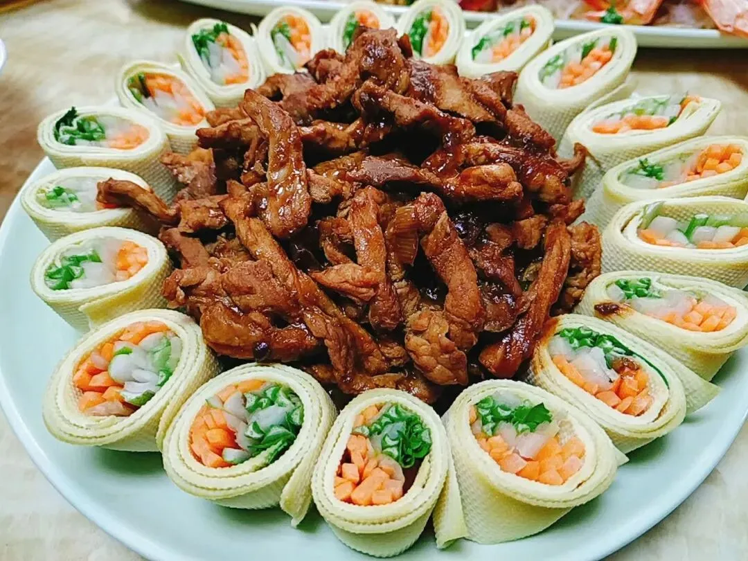 中间是酱香浓郁的肉丝做“花蕊”,外圈用豆皮蔬菜卷摆成“花瓣”,整体呈现出花朵绽放的视觉效果,完美契合“花开富贵”的寓意,上桌就是视觉焦点。