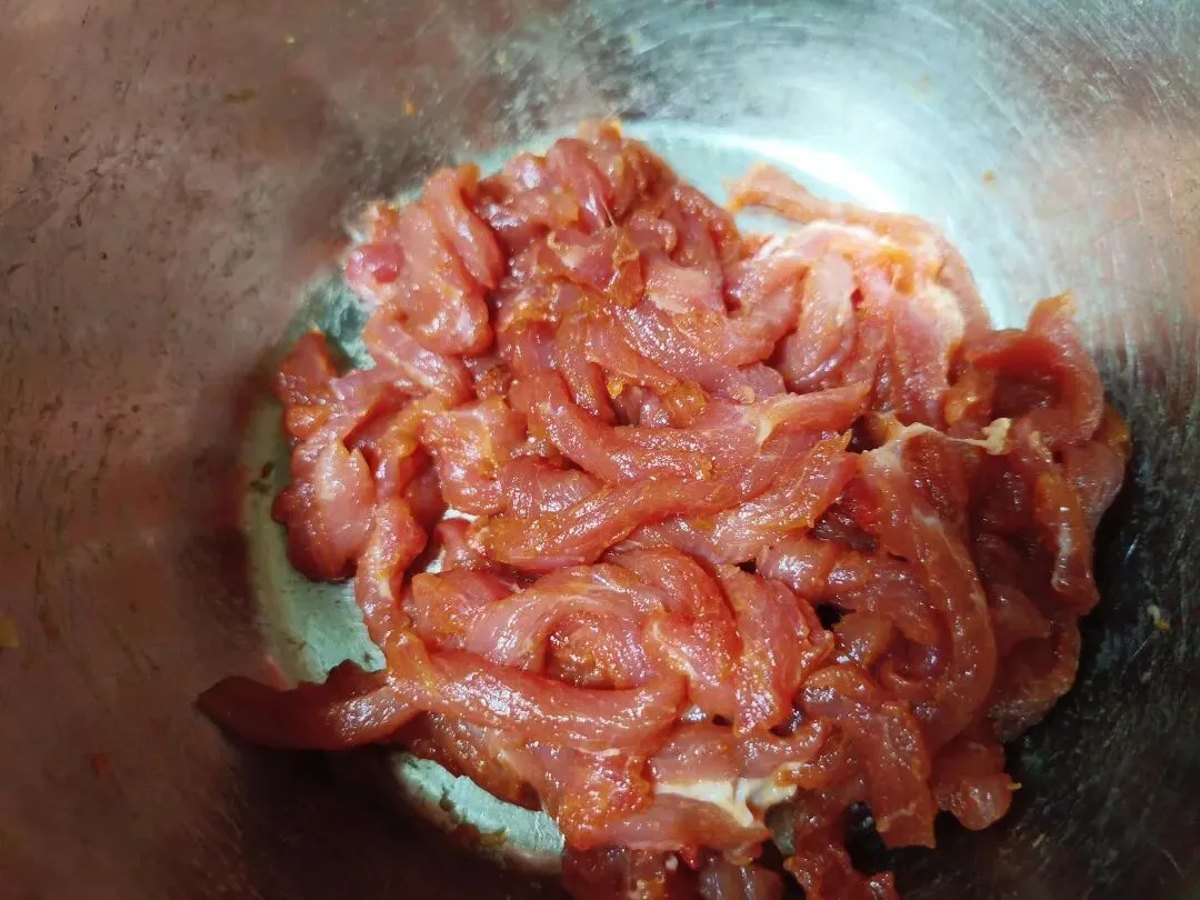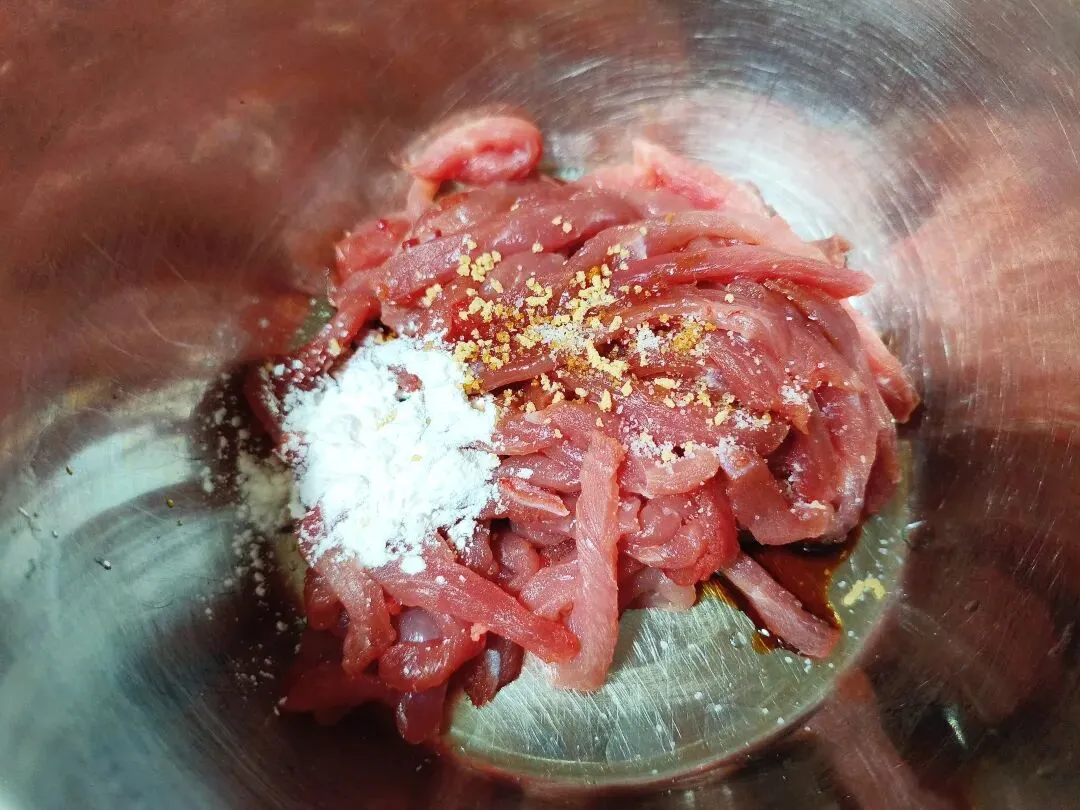 1. 猪瘦肉切成粗细均匀的肉丝,加米酒、生抽、盐、菌菇粉和淀粉抓匀,再淋少许食用油拌匀,腌制10分钟(锁水嫩肉)。