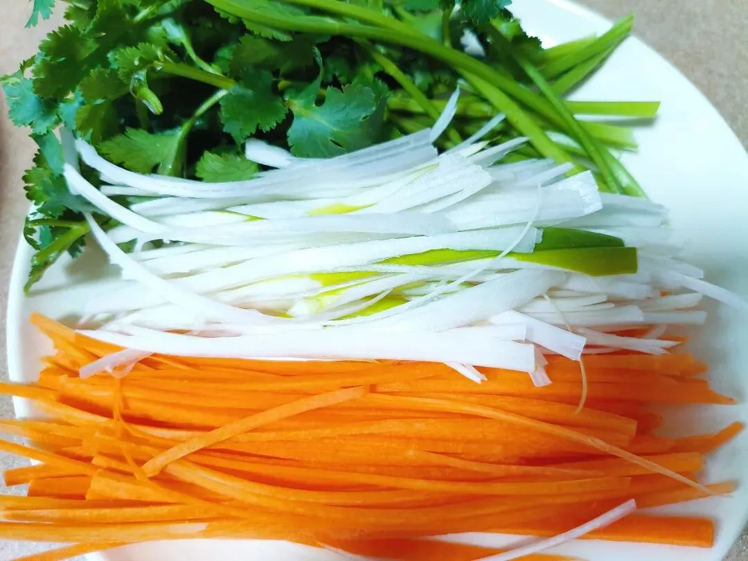 胡萝卜、大葱切丝,香菜切段