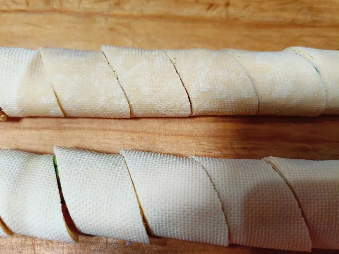 1. 卷蔬菜豆皮卷:豆腐皮平铺,在一端码上葱丝、胡萝卜丝、香菜段,从一侧卷成卷,接口处朝下摆放。