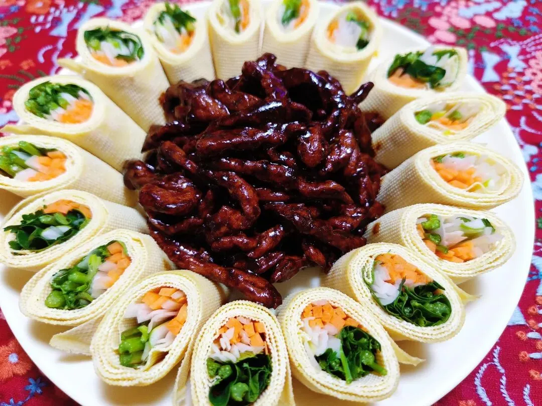 3. 最终绽放:切面朝上,在盘子边缘摆成一圈作为“花瓣”。将炒好的京酱肉丝盛在豆皮卷中间,做成“花蕊”,一盘“花开富贵”就完成啦~