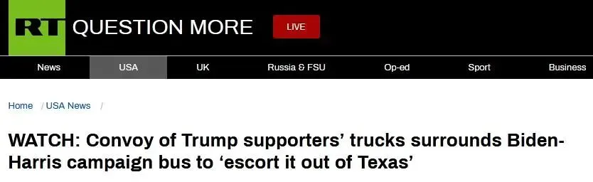 “今日俄罗斯”(RT)刚刚消息,当地时间10月30日,在美国得克萨斯州,拜登-哈里斯竞选大巴被一队皮卡“包围”,并被迫取消了当天的竞选活动。RT在这则报道的标题上称,这个皮卡车队悬挂着美国国旗和“让美国再次伟大(MAGA)”的旗帜,是特朗普支持者的车队。随后,民主党人谴责此次事件是“危险的骚扰”。