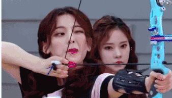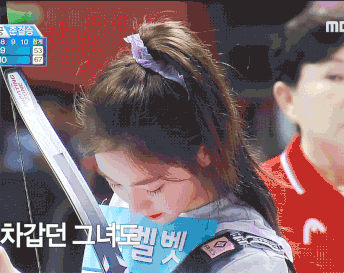 在韩版偶运会的赛场上,也有不少经典镜头,像SM公司女团RedVelvet 的队长,在解说员放下狠话说,只要有人射中10环中心的摄像机,他就请全场选手吃炸鸡后, 一箭帅气命中。