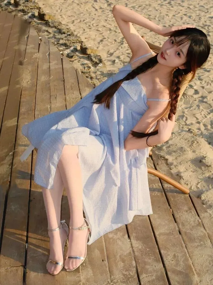 海边穿搭天花板!这件浅蓝色吊带裙让你慵懒又高级,回头率飙升