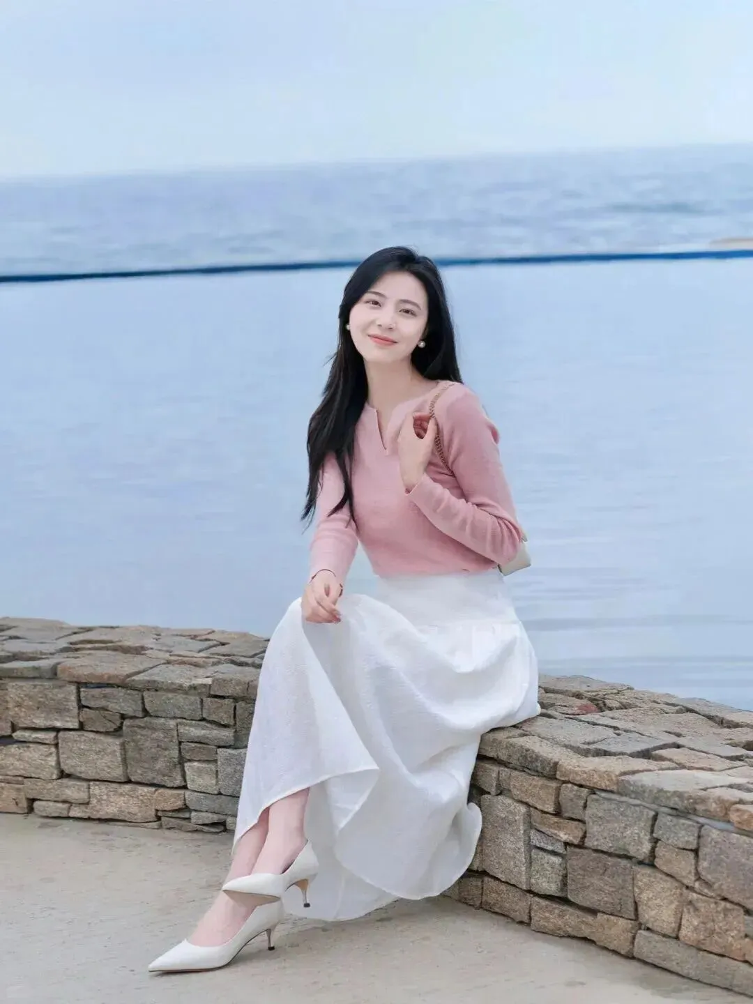 .身衣服.的颜色搭配.得太妙了.。淡淡.的粉色配.上干净.的白色.,整个人都.笼罩.在一层温.柔滤镜里.。和.海边的蓝.天白云.放在一起.,简直不.要太搭.。看.着就让人觉.得放松,好.像海风都跟.着变温.柔了.