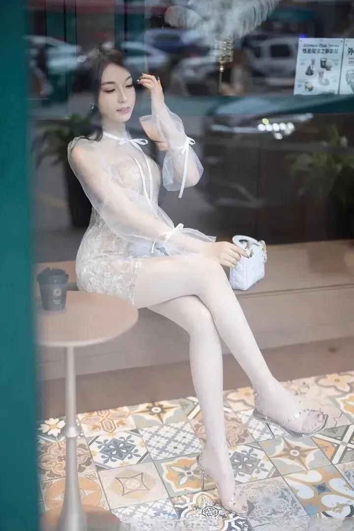 .午和.闺蜜约.了喝下午.茶,坐在.公园的木.椅上.。阳光.从树叶.缝隙里洒.下来,.落在裙.子上.,光影特.别美。脚.上穿了.一双.透明的高.跟鞋,鞋跟.大概五厘.米,走路稳.当,也很拉.长腿型.。袜子.特意.选了白色蕾.丝边的,坐.下的.时候.微微露出.一圈花边,.和裙子.呼应上了.