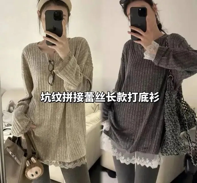 坑纹拼接蕾丝长款打底衫,软糯贴肤,秋冬叠穿神器~