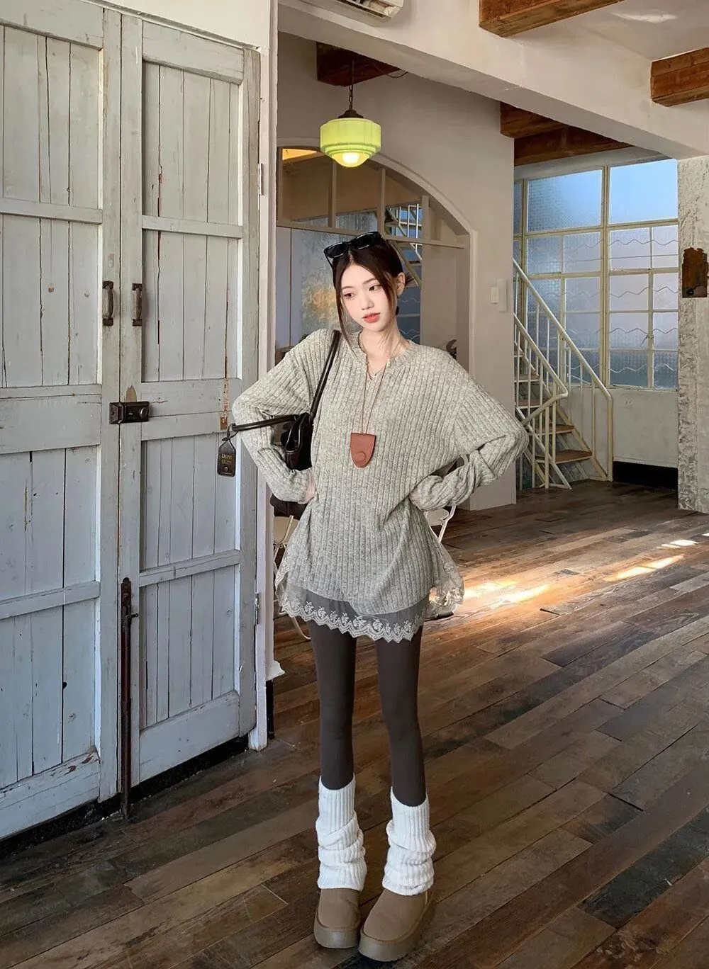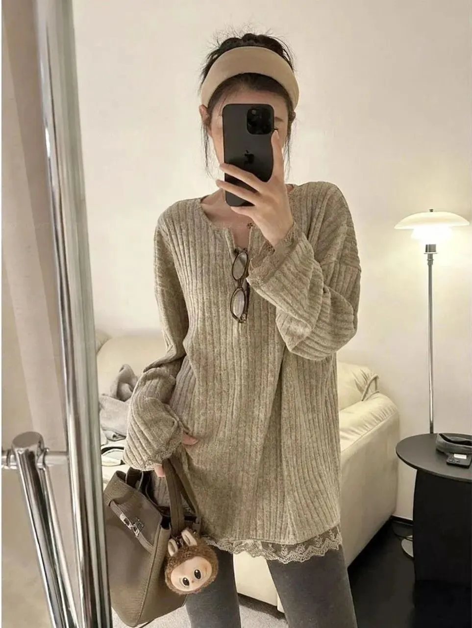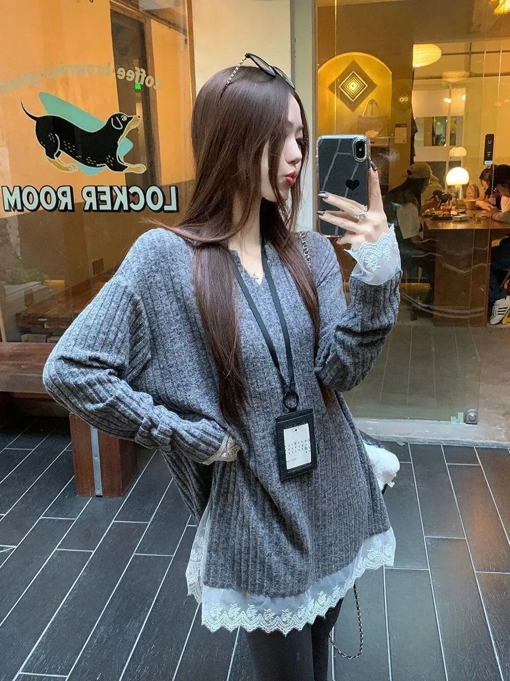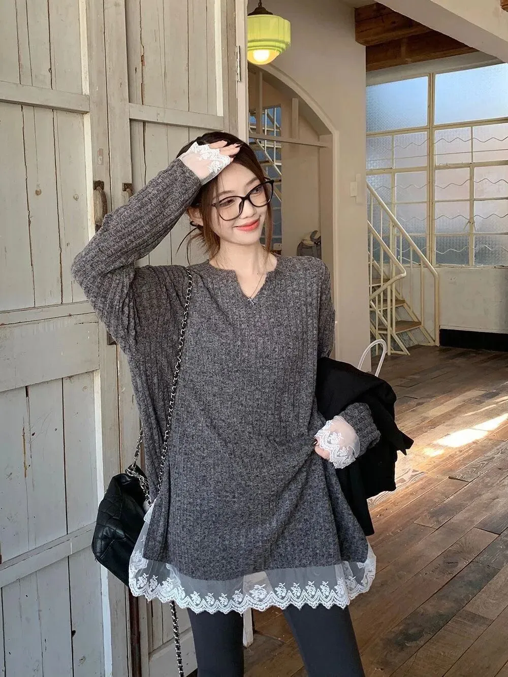 这款蕾丝V领中长款针织打底衫很适合秋冬!高腰设计显腿长,搭配鲨鱼裤刚刚好日常通勤或约会都挺合适。