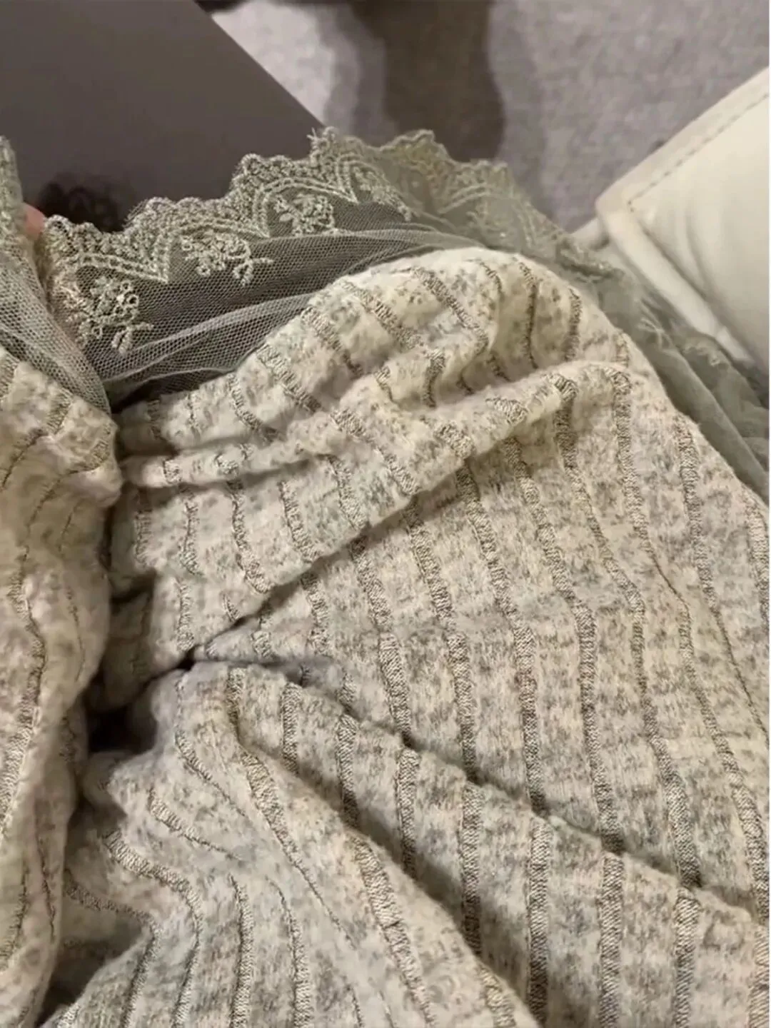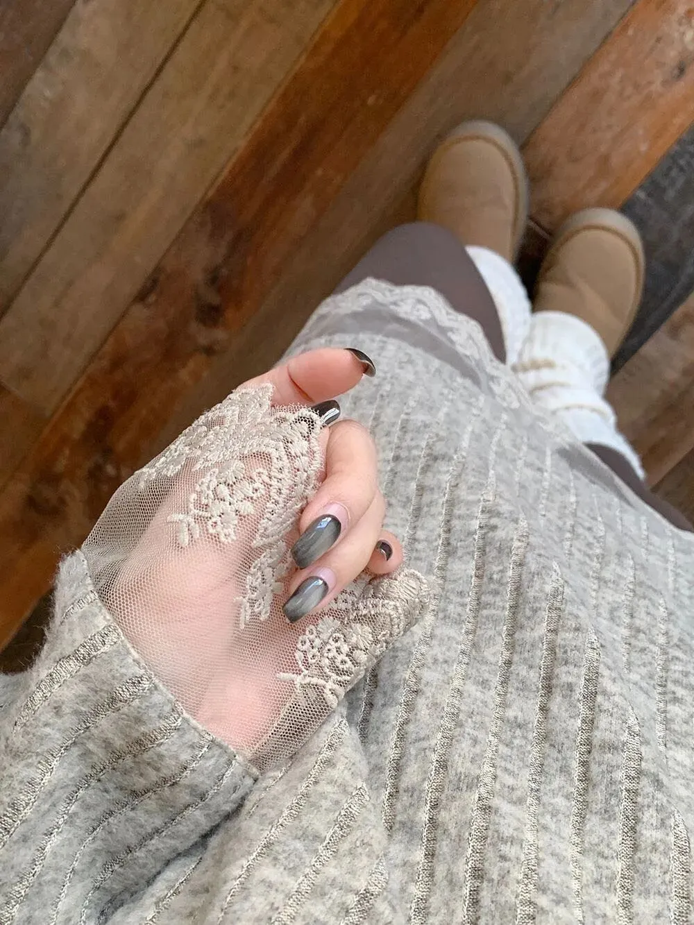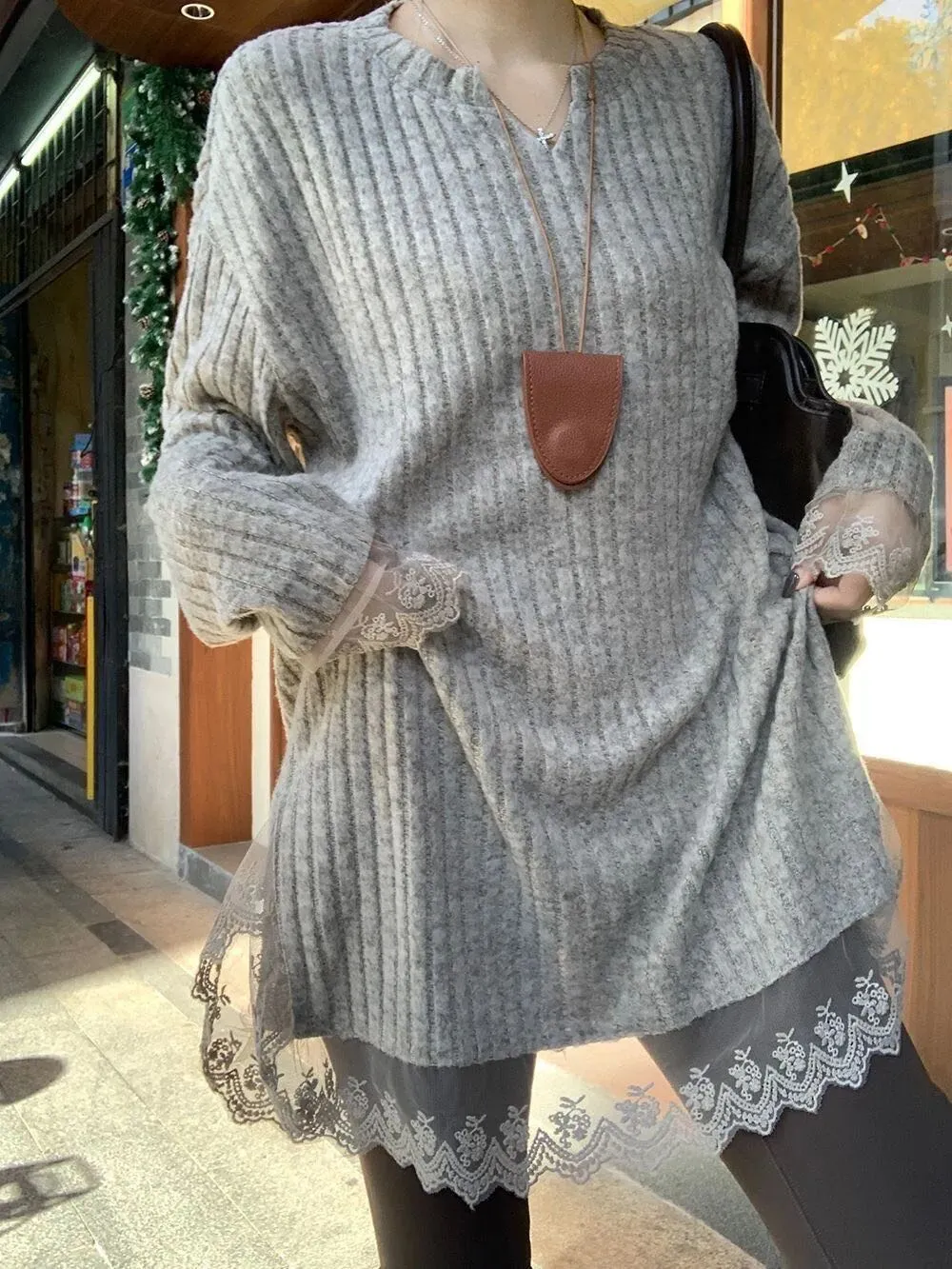蕾丝拼接的设计真的戳中我,袖口和下摆的董丝边增添了温柔感,又不会太甜腻,慵懒中带点小女人味