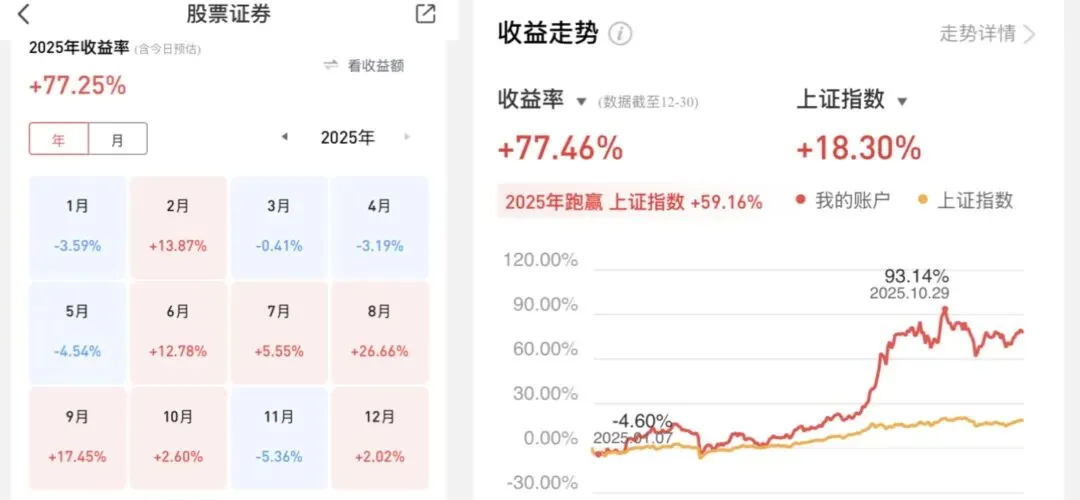 截止收尾,2025年无情中长策略带着学员小伙伴,终是斩获了77%的收益,显著跑赢上证指数。