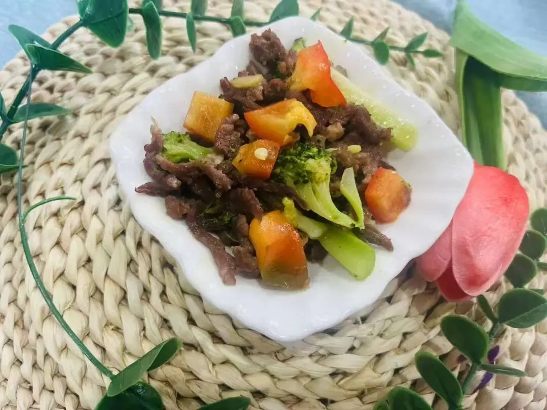 西兰花炒牛肉、海鲜菇炒鸡蛋、三鲜汤