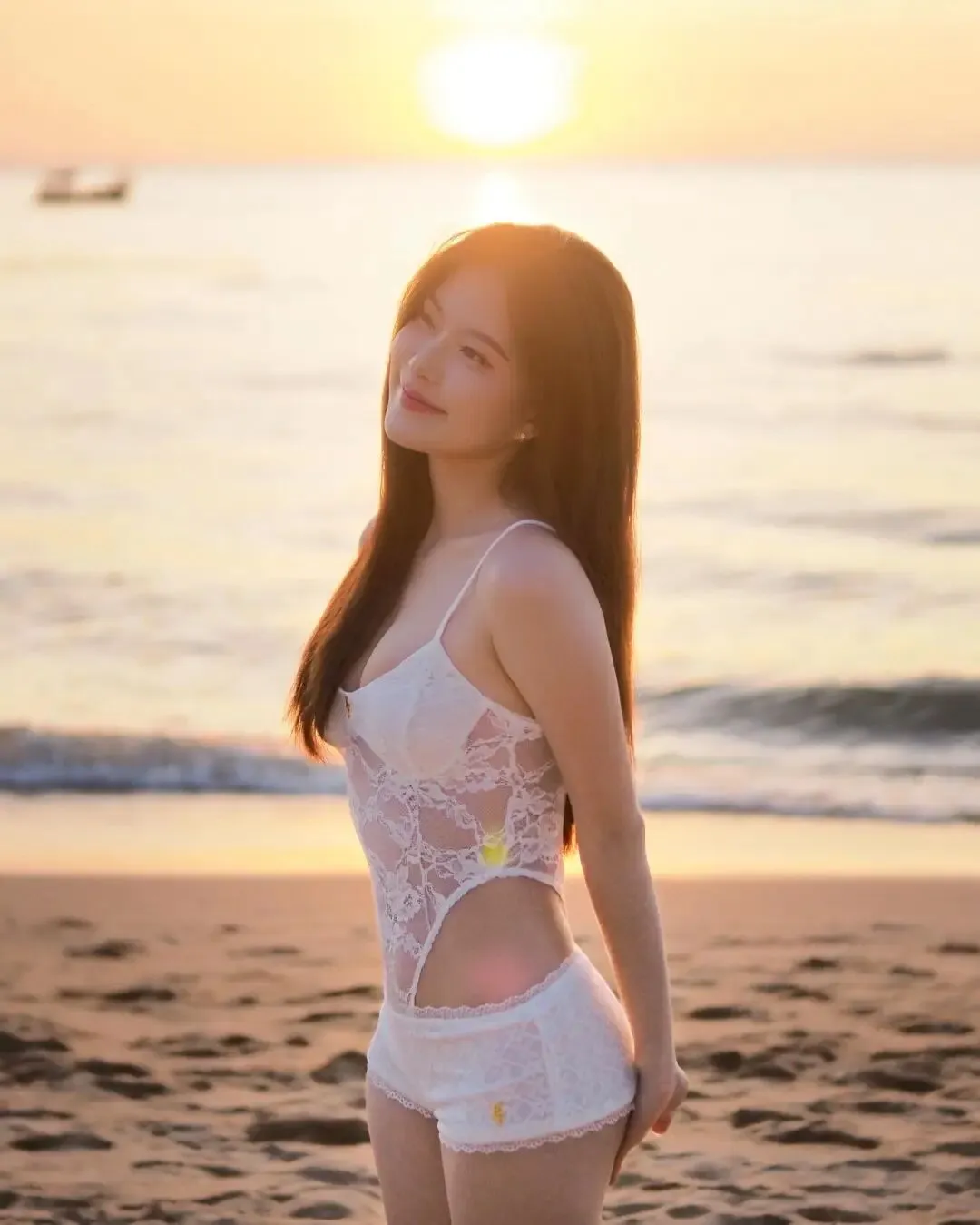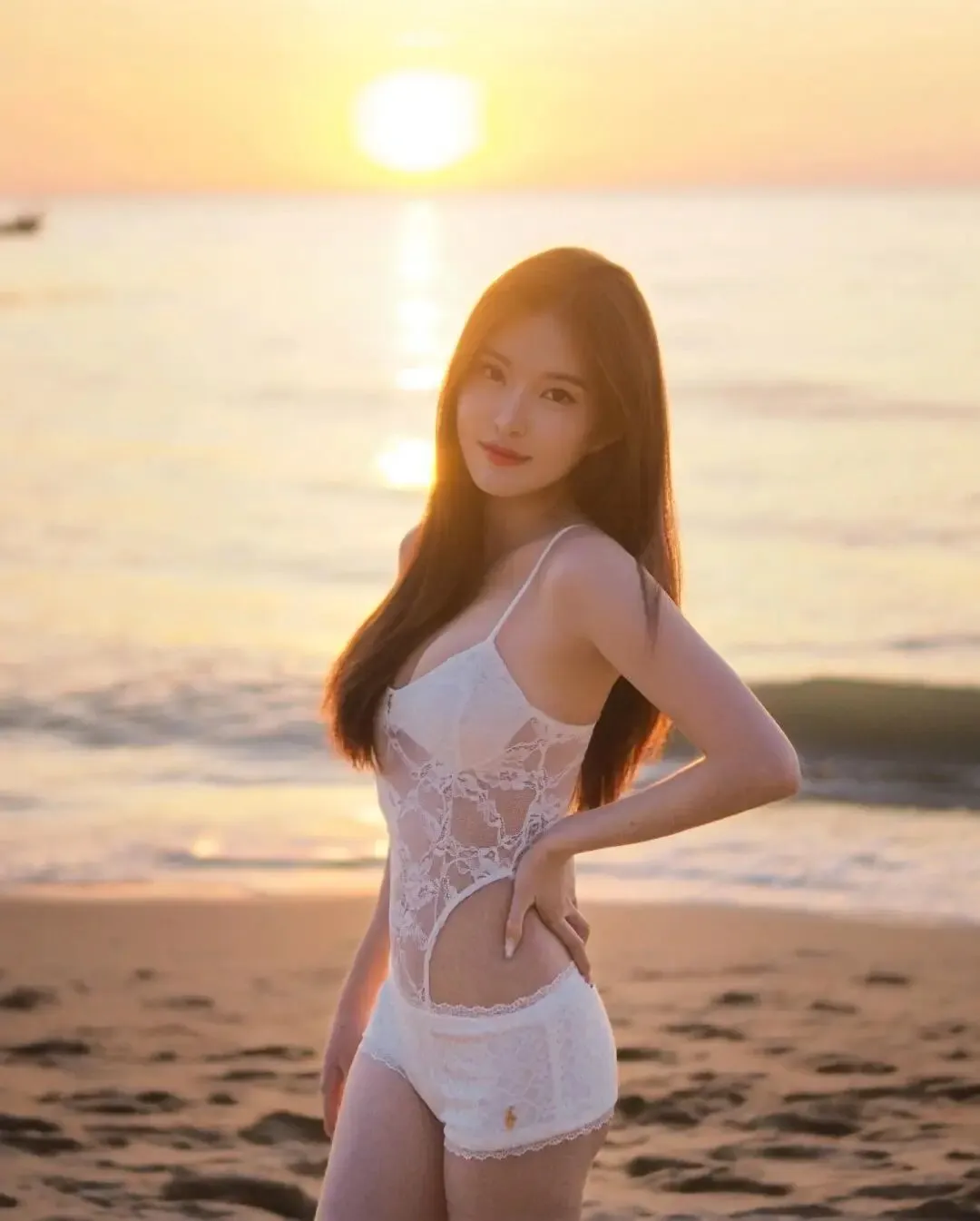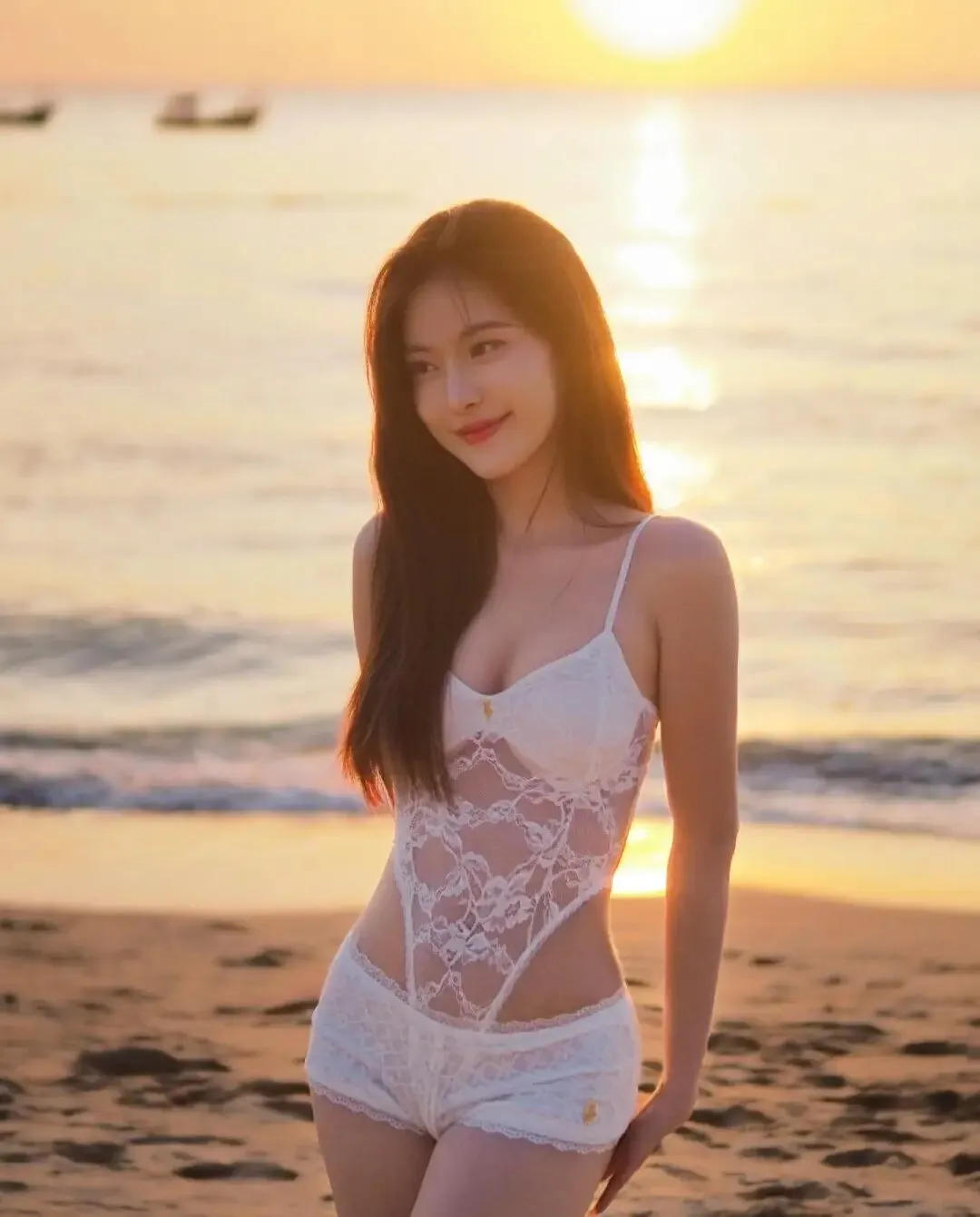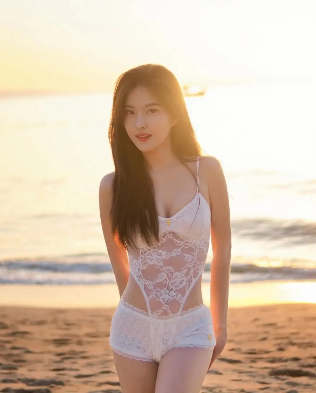 当前位置:首页>美女资讯>清纯女孩,白色蕾丝吊带连体衣,夕阳海滩上尽显优雅与性感