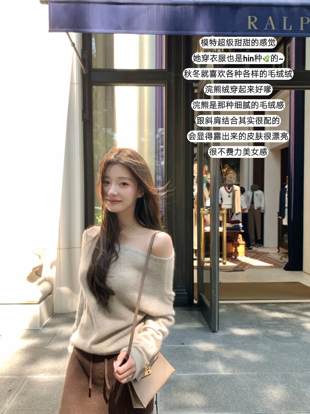 街角的阳光吻过米色斜肩毛绒衫,绒面如云朵般蓬松软糯,棕色抽绳裤的系带垂在腿侧,浅棕包包轻倚臂弯,像把温柔妥帖收纳。