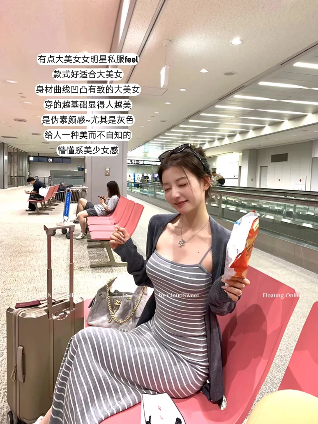 转身是机场红椅上的灰白条吊带裙,灰色开衫松垮地搭在肩头,手里的零食袋藏着几分随性,金属行李箱静静立在一旁,是旅途中的松弛感。