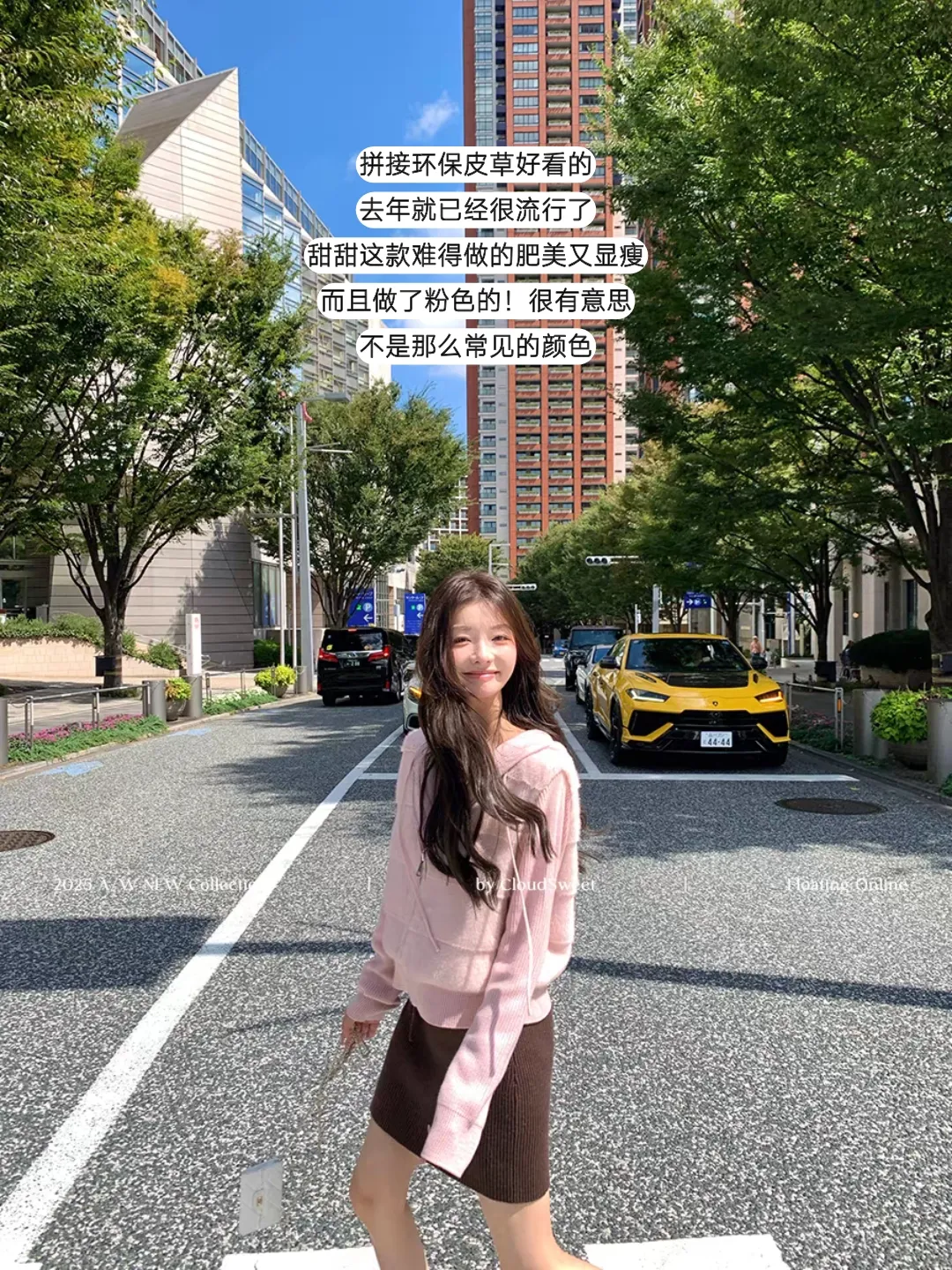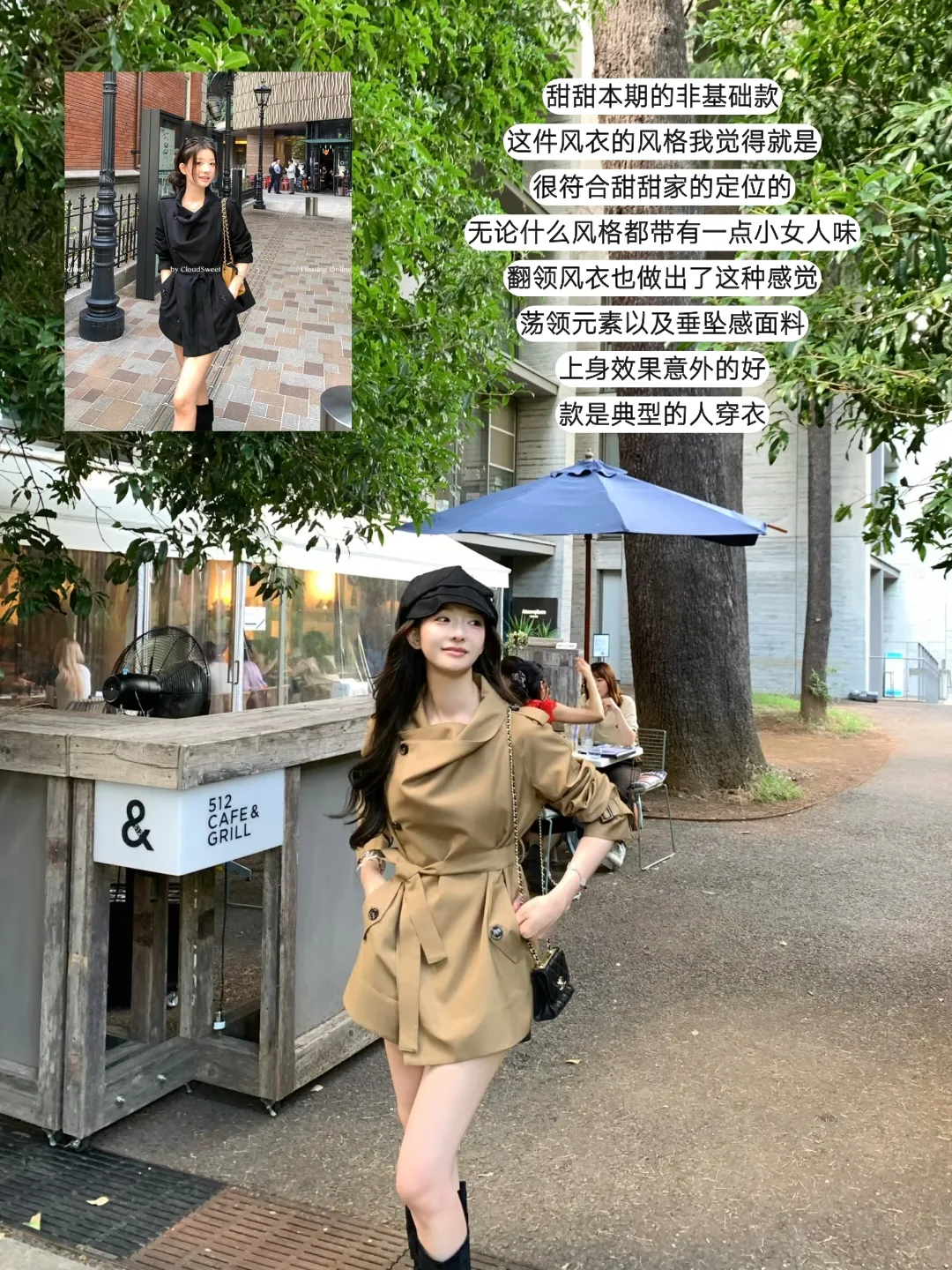 咖啡店外的卡其风衣裹着秋风,黑色贝雷帽压着发梢,蓝色遮阳伞在树影里撑开一片清凉;街道路口的粉色毛绒卫衣,把春日的甜揉进秋冬,棕色短裙衬得腿型纤细,黄色跑车从身后驶过,成了背景里跳跃的亮色。