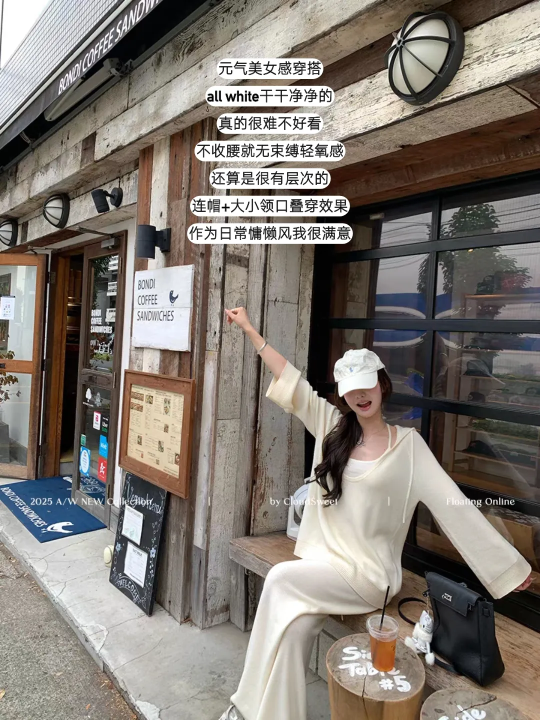 试衣间的镜子映出米色山羊绒内搭的细腻,印花披肩轻轻搭肩,瞬间添了贵气;白色连帽套装坐在木墙前,棒球帽遮住半张脸,冰饮冒着水汽,是日常的无束缚轻氧感。