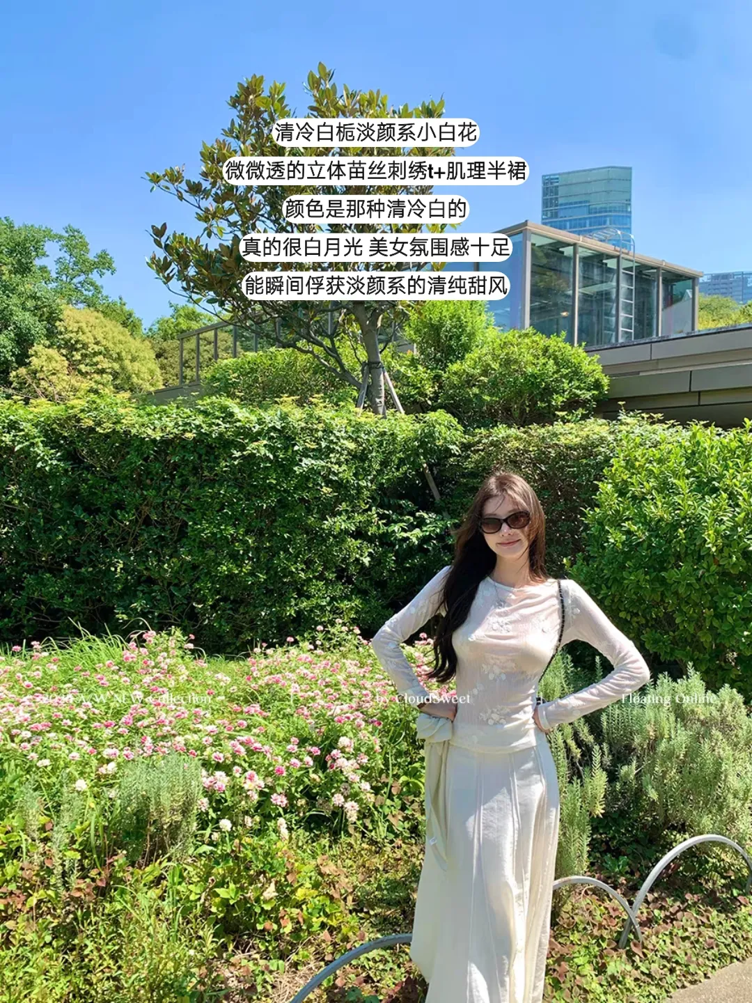 深灰运动套装裹着舒适自在,黑框眼镜架在鼻梁,牛皮纸袋拎在手里,是伪素颜的慵懒;花园里的白色刺绣t透着微光,立体蕾丝如星子散落,白色半裙垂坠如流水,身后花丛与玻璃建筑相映,成了清冷白栀般的存在。