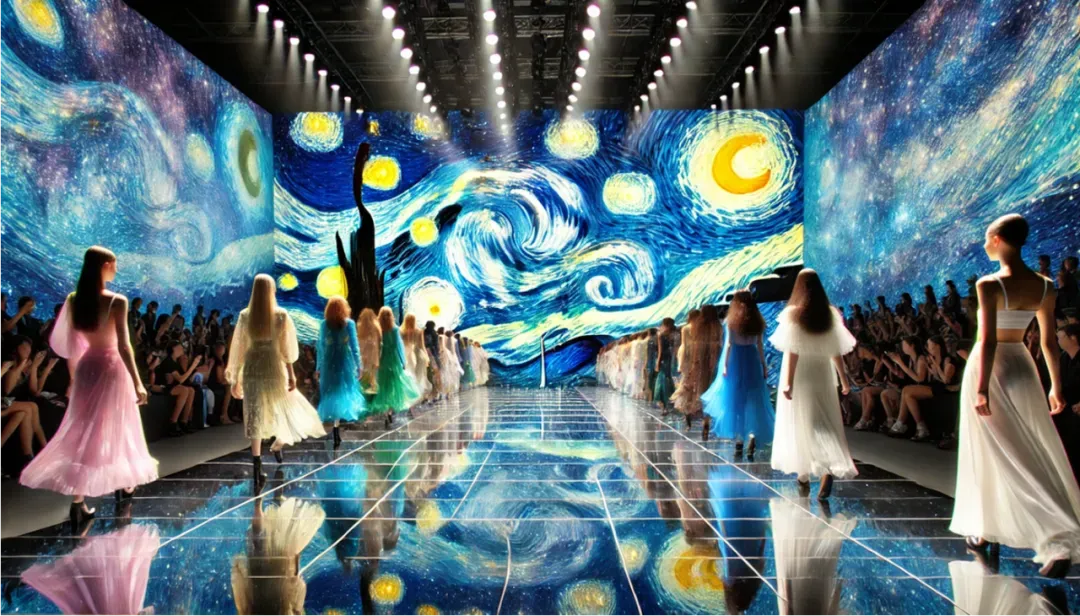 每场时装秀都以梵高等世界著名艺术家的杰作为背景,通过令人惊叹的LED屏幕及投影科技呈现,为观众提供一场身临其境的艺术盛宴。