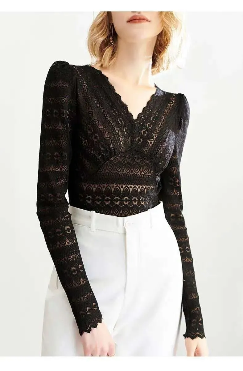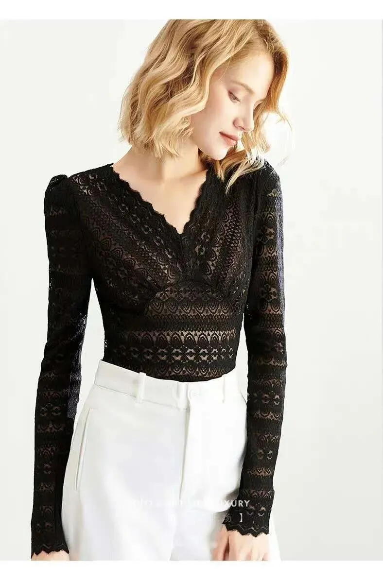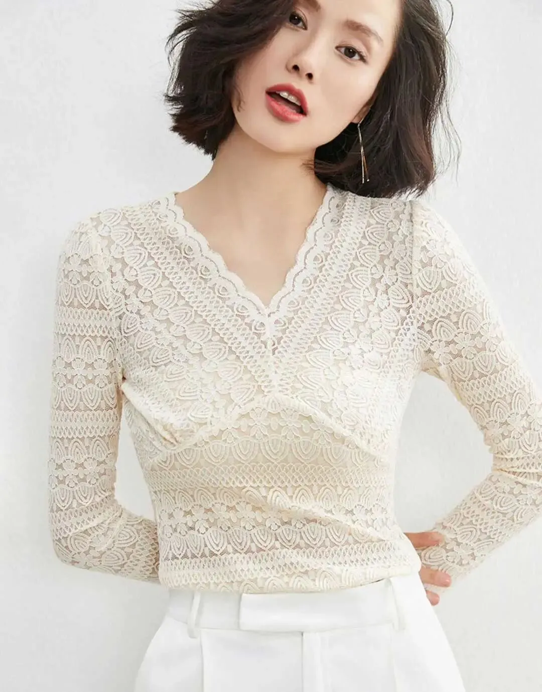 可以说是,美美的【V领蕾丝打底衫】