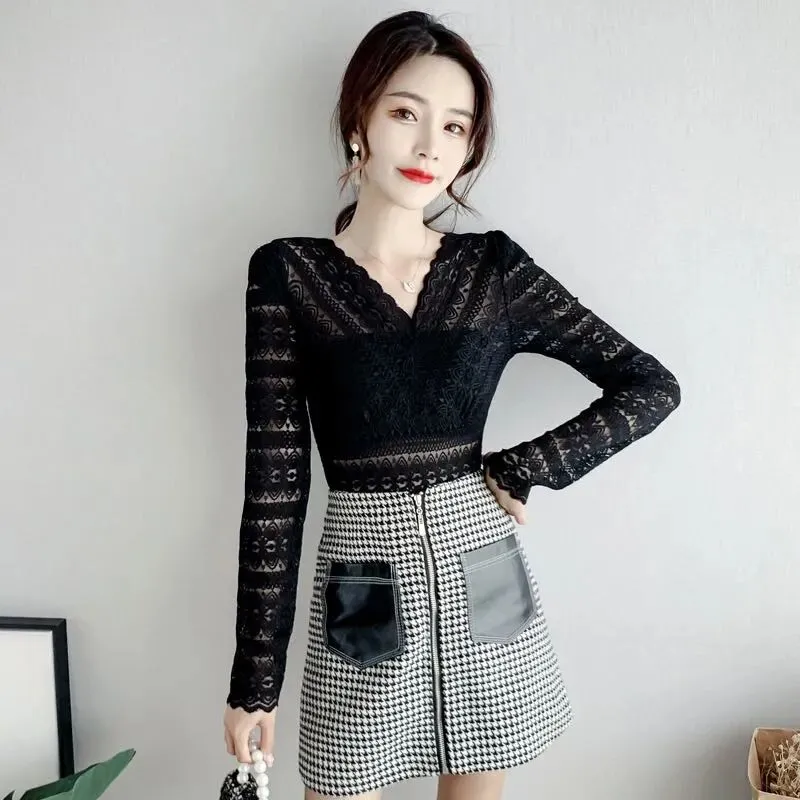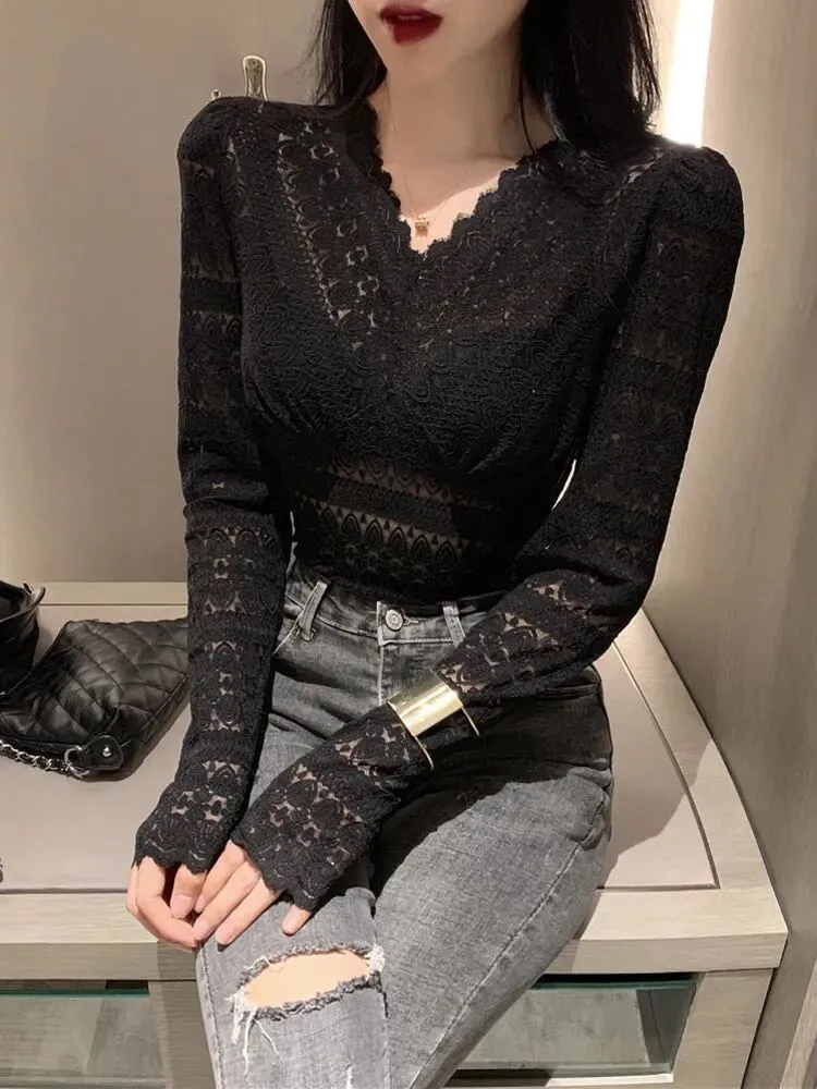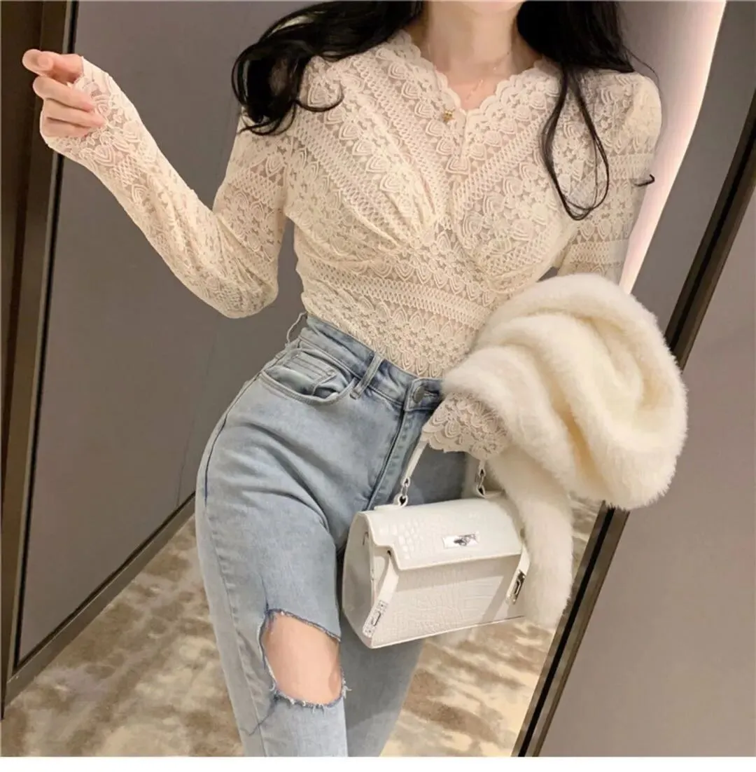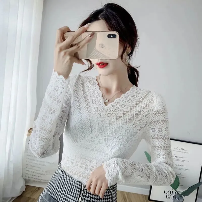 可以说是,美美的【V领蕾丝打底衫】
