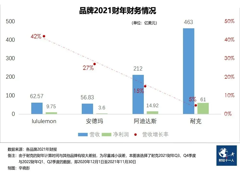 2021年,国际品牌依旧在疫情等外部因素的阴影中挣扎,相比之下,lululemon可以算是最大赢家。品牌年营收与安德玛(UA)持平,增速却高出对方50%以上;在多项数据的对比中,lululemon都超过了耐克、阿迪和安德玛这三位其年报中特别标记的竞争对手。