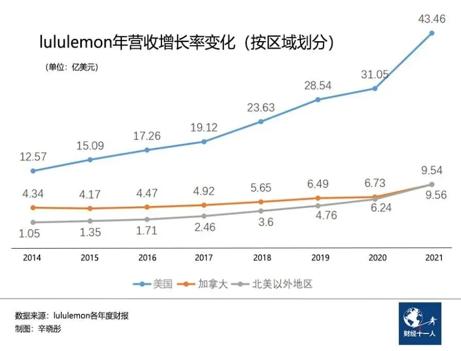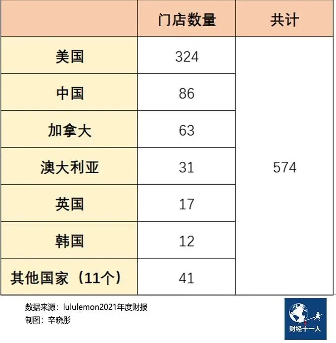 lululemon在2014年进入中国,最初增长较为平稳,但近几年有加速之势。尽管总部一直没有单独公布中国市场的营收数据,但中国所在的“北美之外市场”营收已经超越全球第二大市场加拿大(2021年财报数据),且中国市场门店数量大幅超过除美国外的其他国家。因此,外界普遍认为中国已是lululemon继美国、加拿大之后的全球第三大市场。