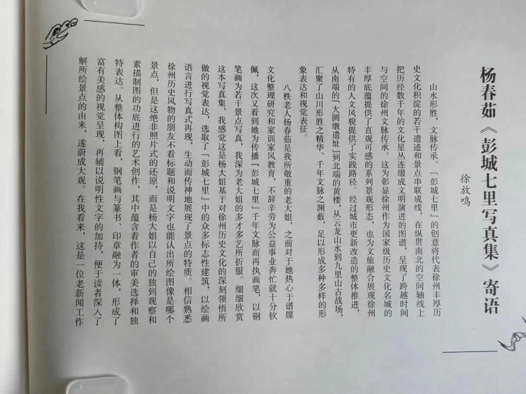 “彭城七里”是徐州基于历史文脉的中国式现代化城市改造。本届市委、市政府大格局、大视野、大布置,为徐州城市基建传承了文化脊梁,为彭城未来的新美创造了希望。杨大姐的素描集取材于彭城的自然山水造就、千年文脉的遗存,不仅构图给人以崇高的壮美,更多的是蕴含了徐州人英勇豪迈的大气雄风、兼收并蓄的博大胸怀和有情有义的民风底色。图上的建筑曾经是伴随千千万万彭城儿女成长的伙伴,曾经是天涯海角彭城游子的梦想和思念。她以八秩之龄,以笔为舟,溯游千年长河,其作非止于景、更在于情。此集问世,实为历史与艺术的双重馈赠,既为徐州立传,亦为后世存鉴。愿读者随画中墨痕,见山河壮阔,感文脉深沉,悟我彭城如何在时光中淬炼出“南秀北雄”的韵与魂。
