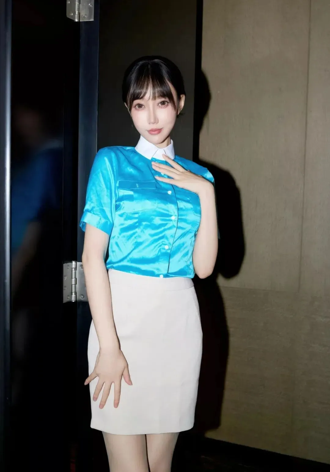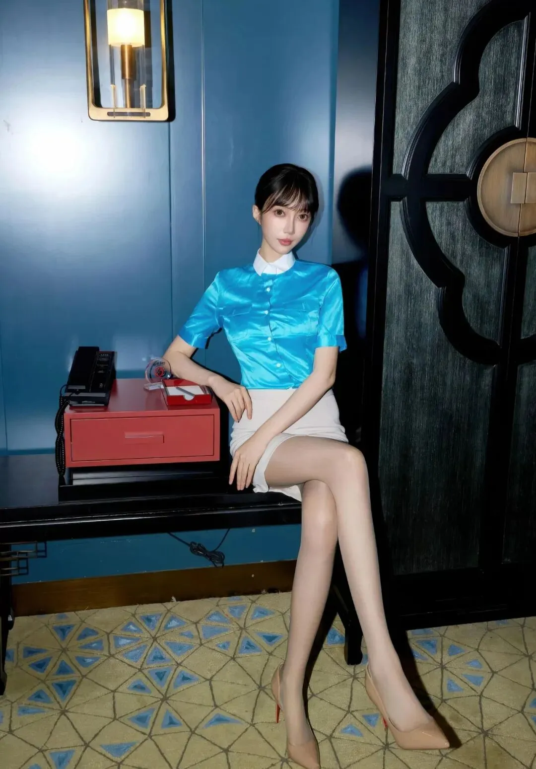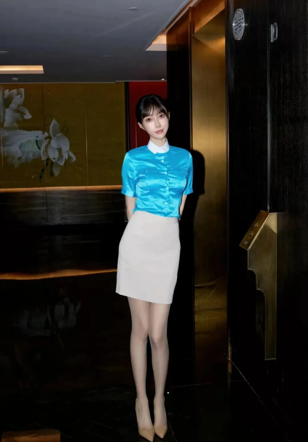 当前位置:首页>美女资讯>写真集|亮蓝缎面衬衫+米白包臀裙,裸色丝袜衬红底高跟鞋,职场风里的优雅性感穿搭典范
