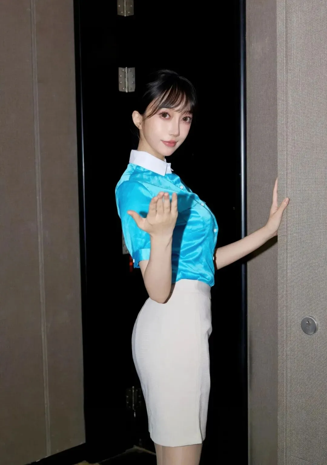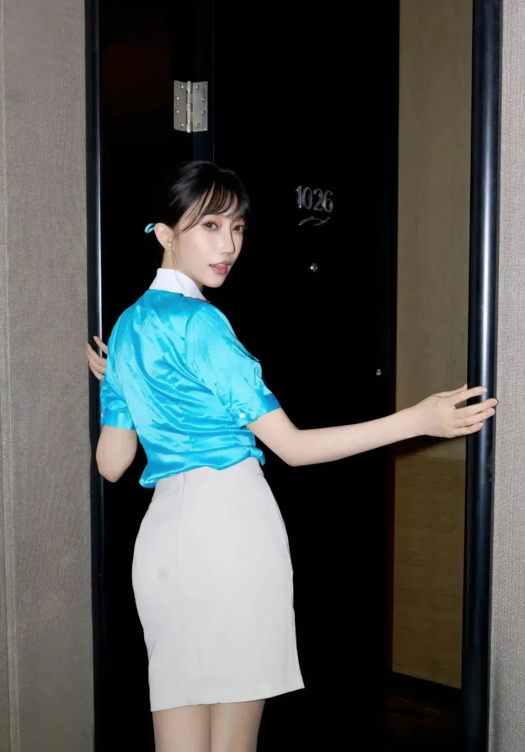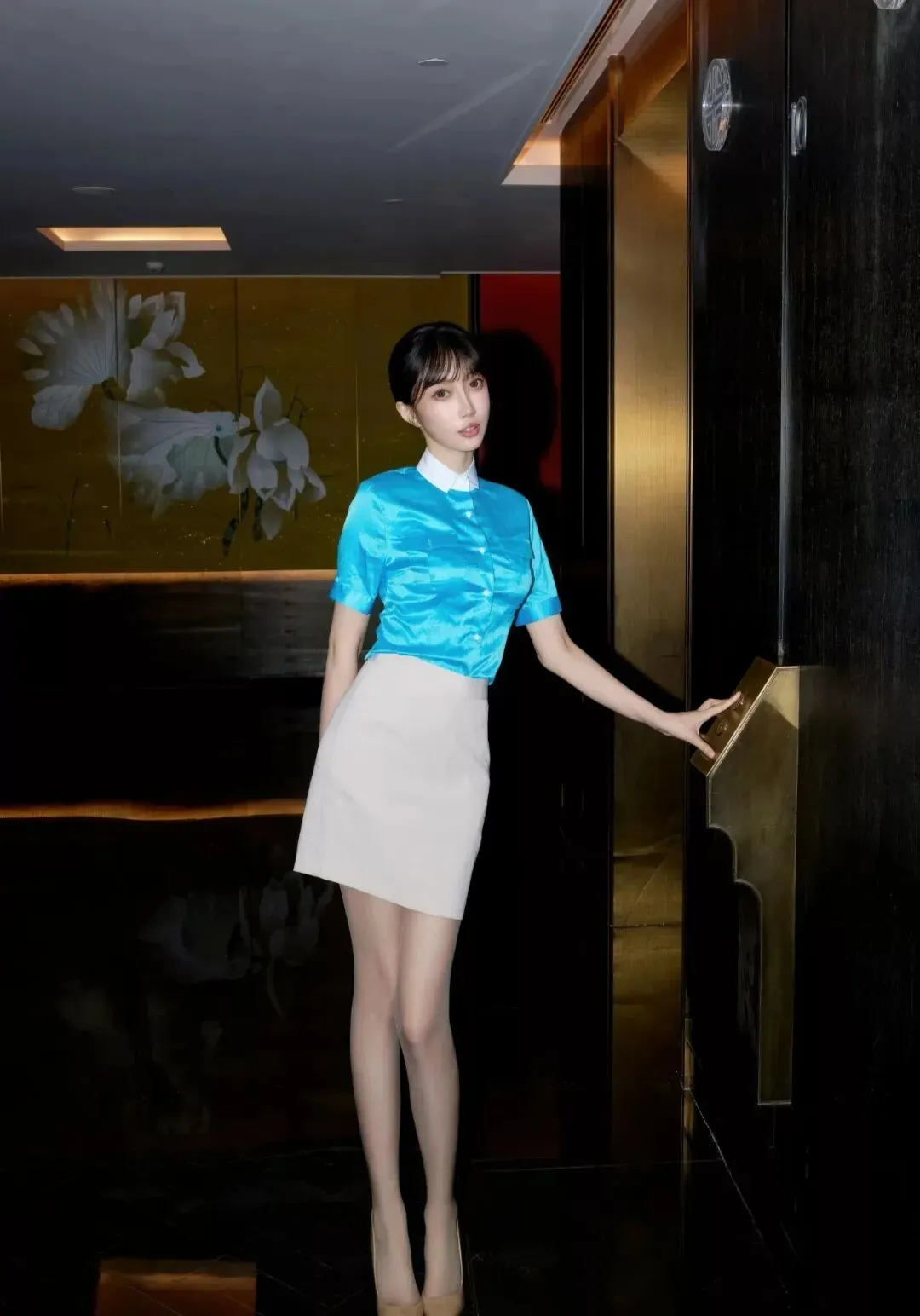 当前位置:首页>美女资讯>写真集|亮蓝缎面衬衫+米白包臀裙,裸色丝袜衬红底高跟鞋,职场风里的优雅性感穿搭典范