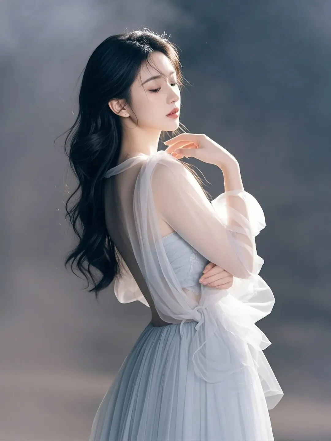 香芋紫的吊带裙衬得她的肤色格外白皙,锁骨若隐若现,带着几分不经意的性感。她抬手拨了拨被风吹乱的发丝,动作轻盈又自然,仿佛每一个细节都在诉说着她的温柔与灵动。